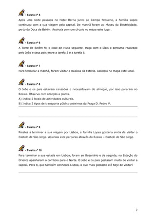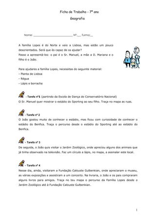 A família Lopes, do Norte, visitou vários pontos turísticos em Lisboa com a ajuda de um mapa. O documento fornece 10 tarefas para traçar os percursos e locais visitados pela família, incluindo estádios de futebol, o Jardim Zoológico, museus, monumentos e o Oceanário.
