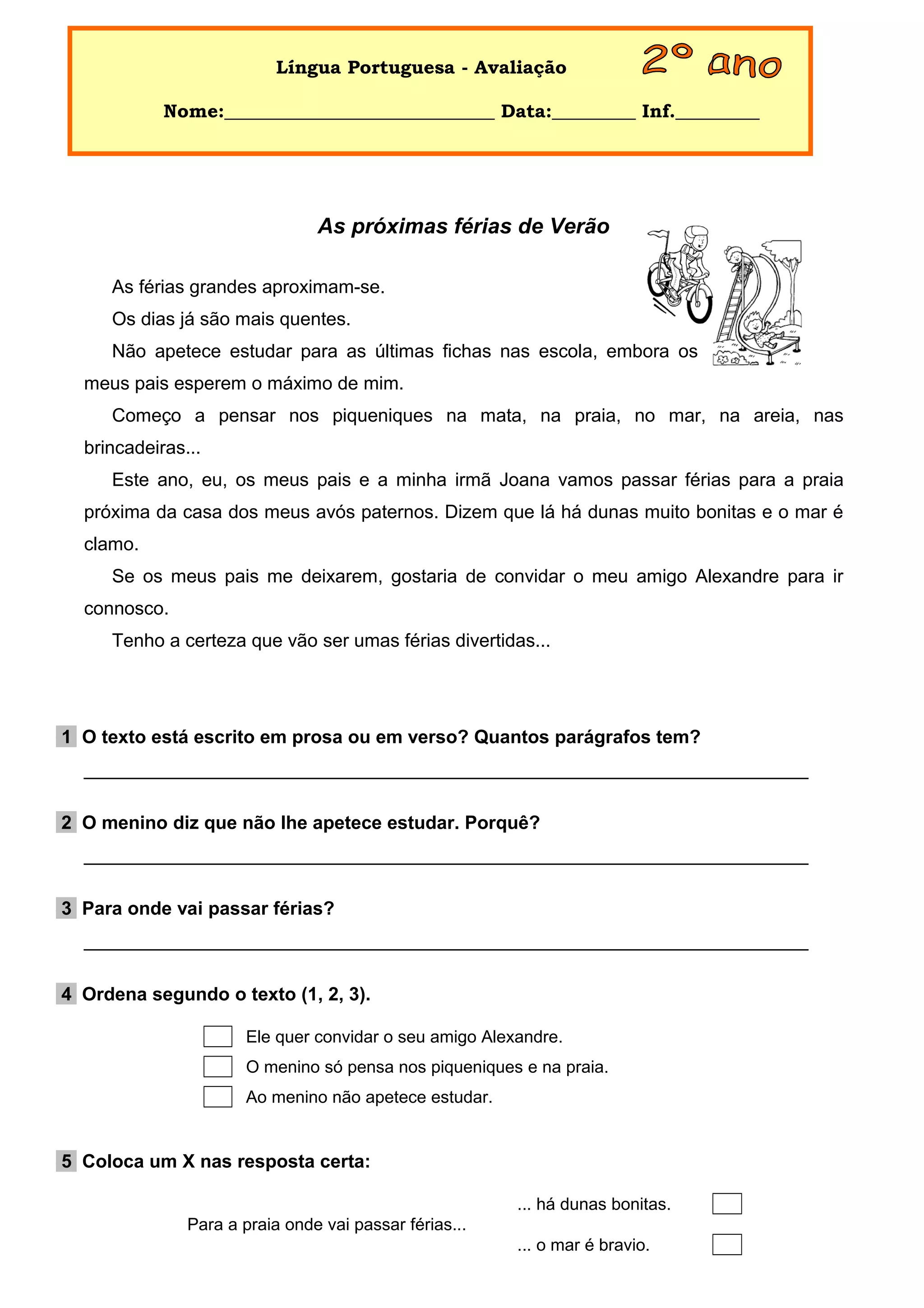 O texto descreve as próximas férias de verão de um menino. Ele não tem vontade de estudar para os últimos testes na escola, mas os pais esperam o melhor dele. Nas férias, ele irá para a praia com a família e espera poder convidar o amigo Alexandre.