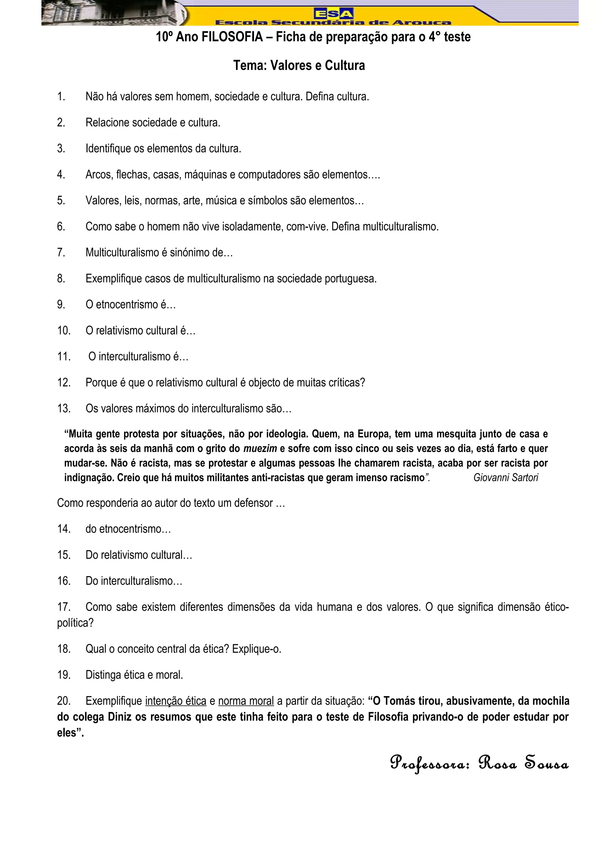 O documento apresenta 20 perguntas sobre valores, cultura, multiculturalismo, etnocentrismo, relativismo cultural e interculturalismo para preparação de um teste de Filosofia. As perguntas abordam conceitos como cultura, sociedade, elementos da cultura, multiculturalismo, ética e moral.