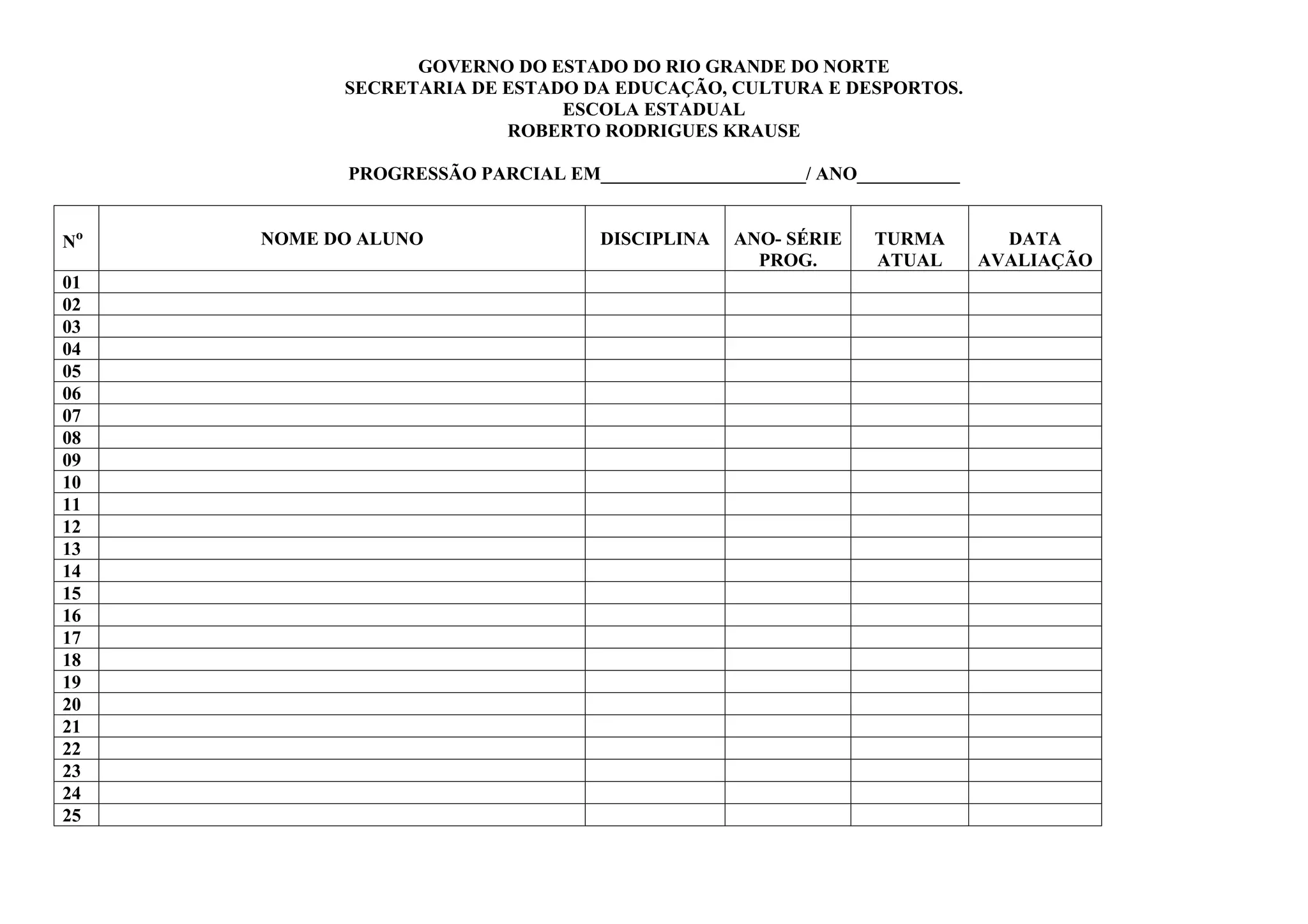 O documento é uma ficha de progressão parcial de um aluno da Escola Estadual Roberto Rodrigues Krause no Rio Grande do Norte, Brasil. A ficha inclui o nome do aluno, ano e série, turma atual e anterior, notas dos quatro bimestres do ano letivo, e espaço para assinaturas do professor, equipe pedagógica e secretaria da escola.