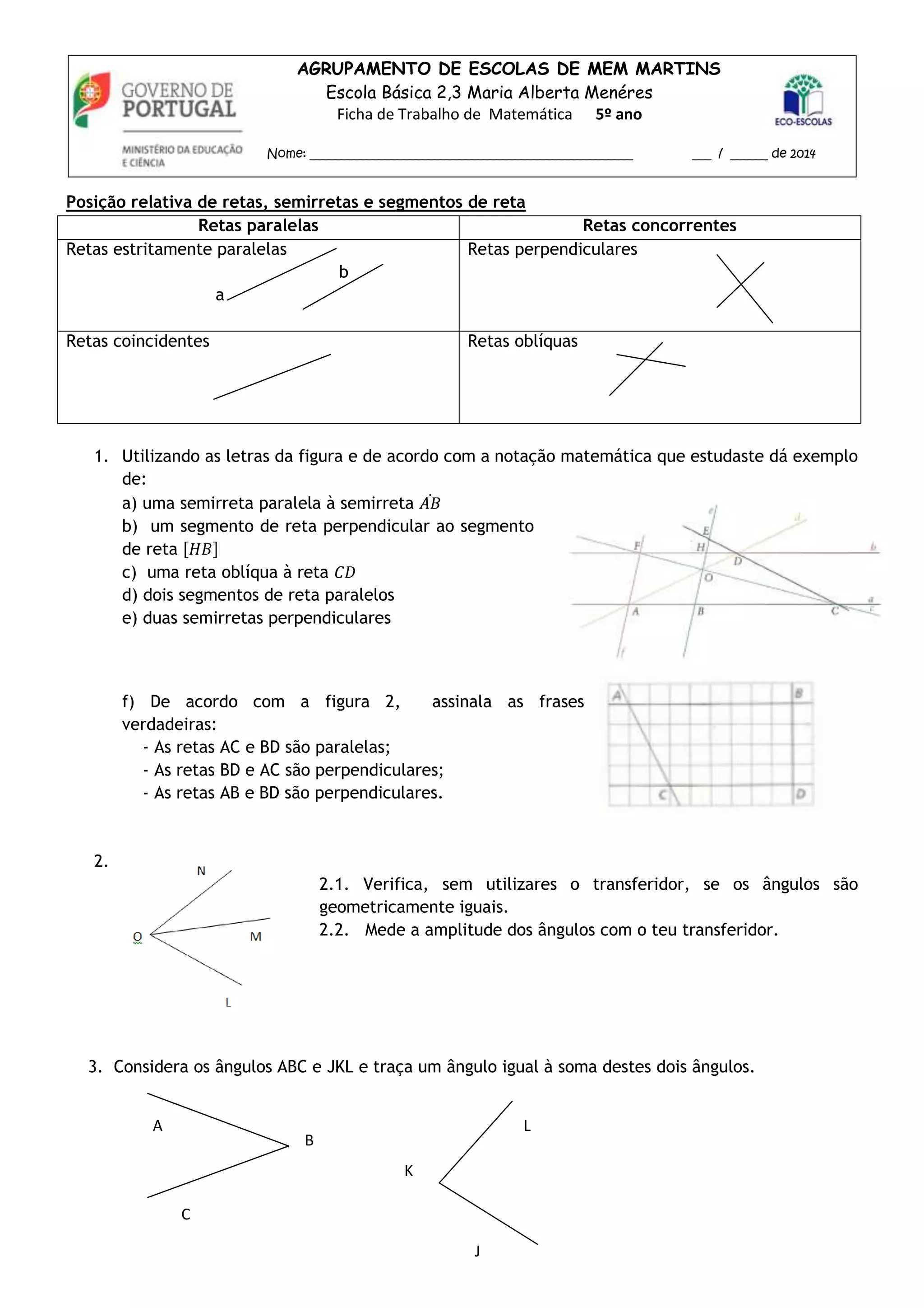 Este documento é uma ficha de trabalho de matemática para alunos do 5o ano sobre posição relativa de retas, semirretas e segmentos de reta. Contém exercícios sobre retas paralelas, perpendiculares e oblíquas, bem como sobre igualdade e soma de ângulos.