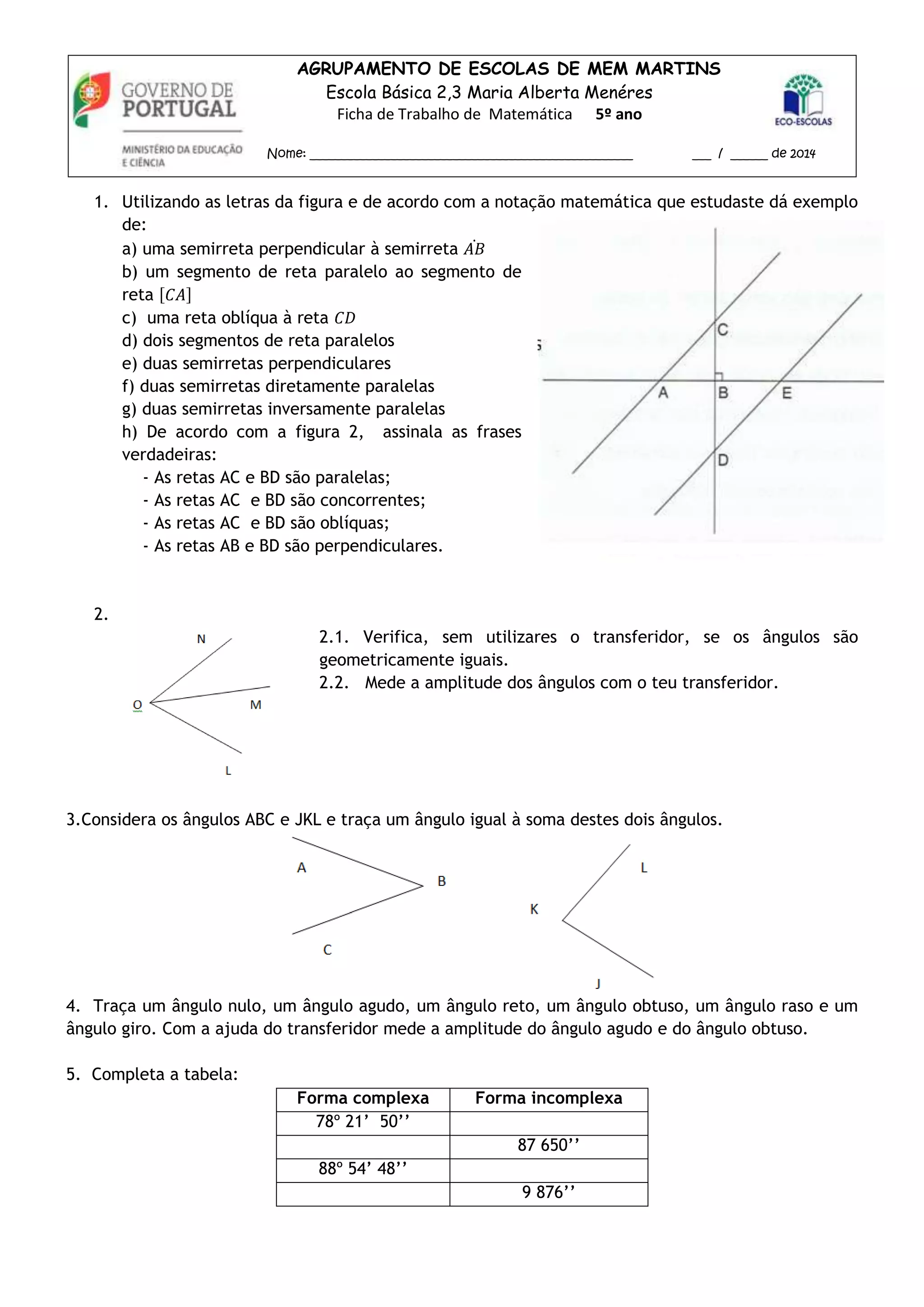 O documento é uma ficha de trabalho de matemática do 5o ano sobre geometria plana. Contém exercícios sobre noções geométricas como retas, segmentos, ângulos e suas propriedades, como perpendiculares, paralelas, complementares e suplementares. Os alunos devem identificar, medir e desenhar vários tipos de ângulos e suas relações.