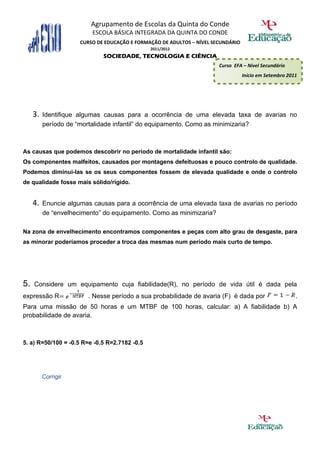 Este documento apresenta um curso de nível secundário sobre sociedade, tecnologia e ciência. Inclui informações sobre o núcleo gerador sobre equipamentos e seus princípios de funcionamento, além de várias fichas de trabalho abordando tópicos como causas de falhas em equipamentos e a curva de mortalidade.