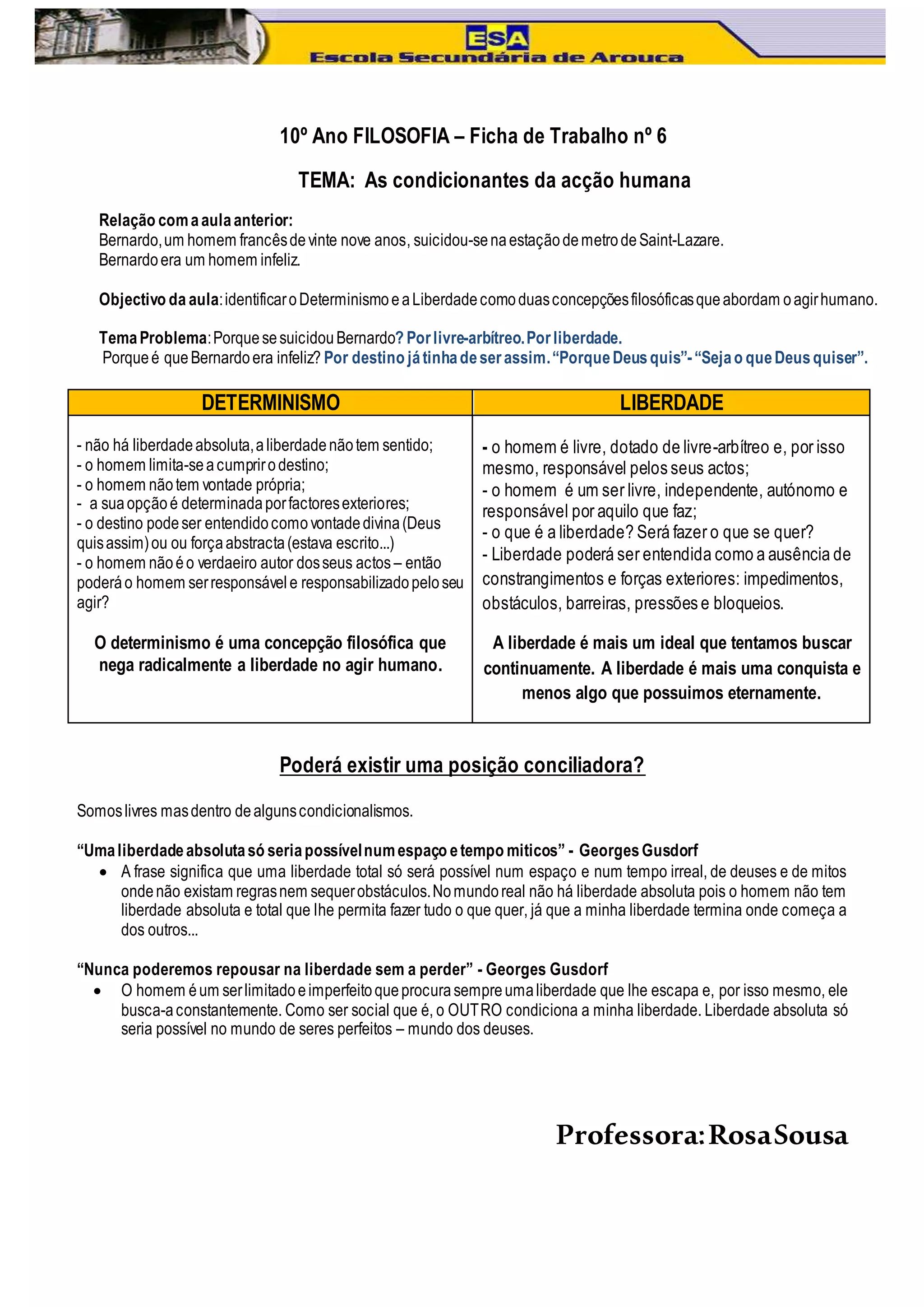 Bernardo, um homem francês de 29 anos, cometeu suicídio na estação de metrô de Saint-Lazare. Ele era infeliz, mas a causa de sua infelicidade e suicídio pode ser atribuída ou ao determinismo (destino) ou à liberdade (livre-arbítrio). A aula discutirá essas duas concepções filosóficas sobre as condicionantes da ação humana.