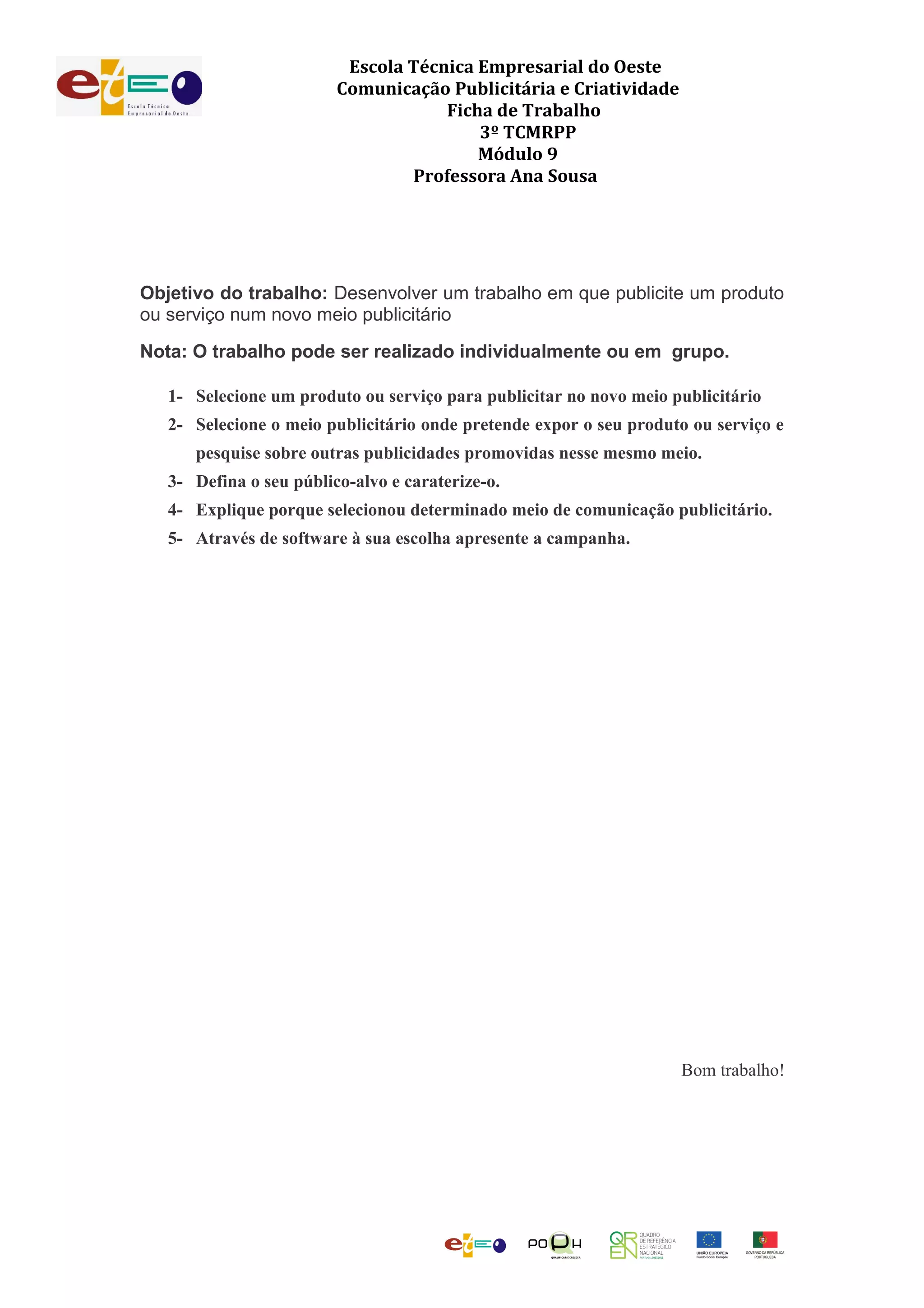 Este documento fornece instruções para um trabalho escolar no qual os estudantes devem selecionar um produto ou serviço para publicitar em um novo meio publicitário, definir seu público-alvo, explicar por que escolheram aquele meio, e apresentar a campanha publicitária usando um software.