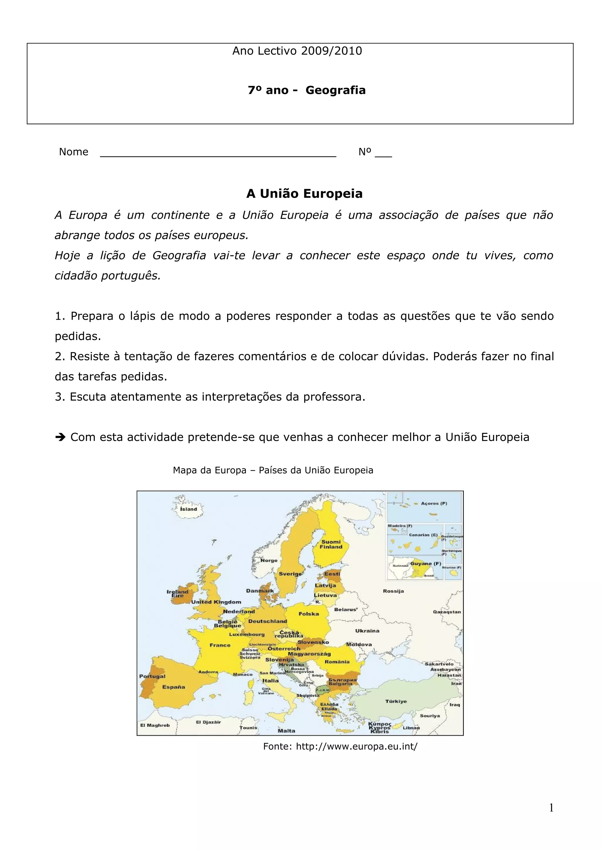 1) O documento é uma lição de geografia sobre a União Europeia para alunos do 7o ano.