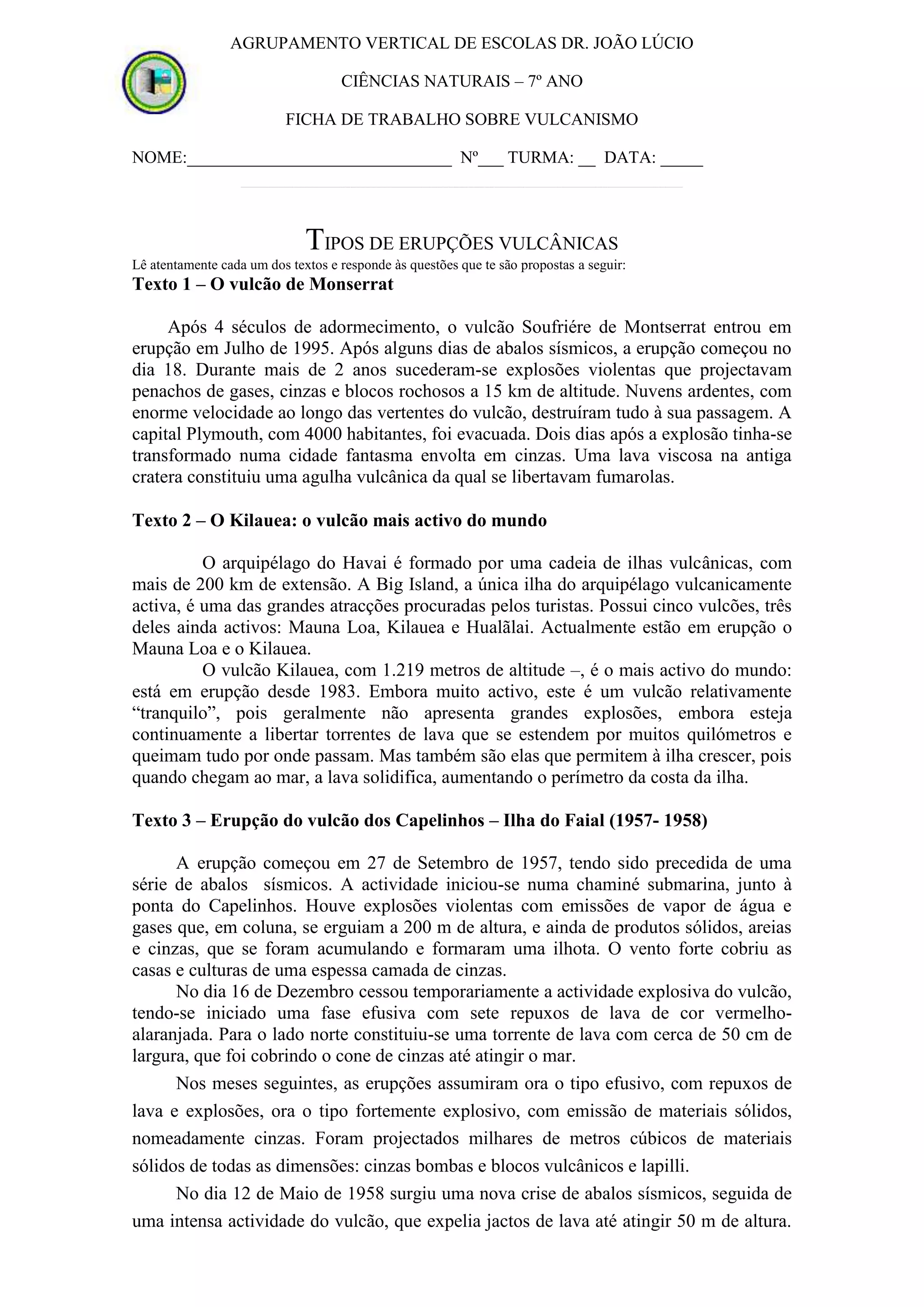 1) O documento descreve três erupções vulcânicas: a erupção do vulcão de Monserrat em 1995, caracterizada por explosões violentas e destruição; a atividade contínua do vulcão Kilauea no Havaí, libertando lava; e a erupção do vulcão dos Capelinhos na Ilha do Faial entre 1957-1958, com fases ora efusivas ora explosivas.