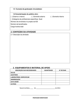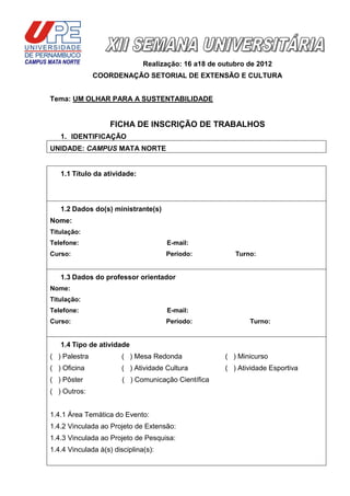 Este documento é uma ficha de inscrição para atividades a serem realizadas entre 16 e 18 de outubro de 2012 com o tema "Um Olhar para a Sustentabilidade". A ficha solicita informações sobre o título, ministrantes, professor orientador, tipo de atividade, área temática, público-alvo e equipamentos necessários.