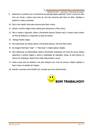 Este documento fornece instruções passo-a-passo para criar uma imagem de uma abóbora sorridente usando várias ferramentas de seleção e camadas em um programa de edição de imagem. Os alunos devem criar uma pasta com seu nome e turma, abrir um arquivo inicial e seguir 16 etapas para selecionar, copiar e colar diferentes objetos para compor a imagem final, salvando-a no formato XCF.