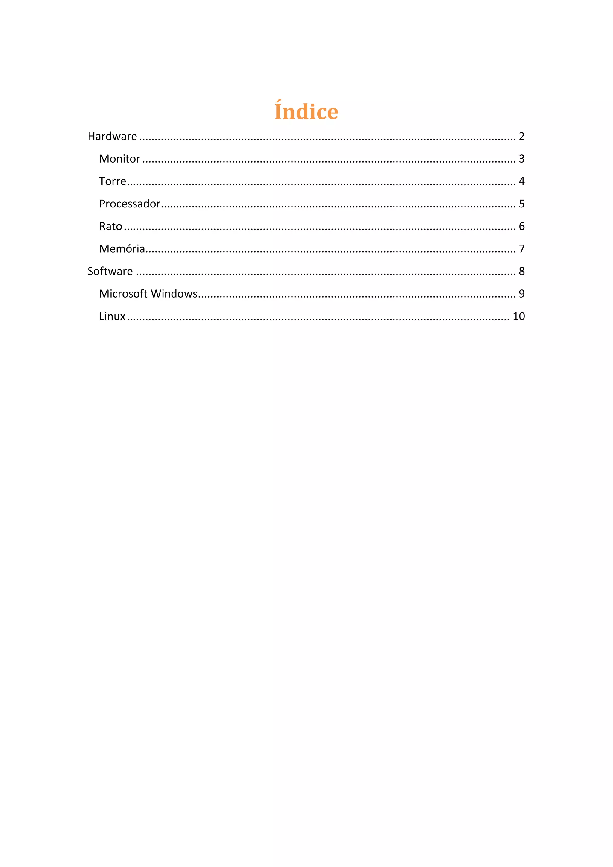 O documento fornece informações sobre os principais componentes de hardware e software de um computador. Discute brevemente o monitor, torre, processador, rato, memória, Microsoft Windows e Linux.