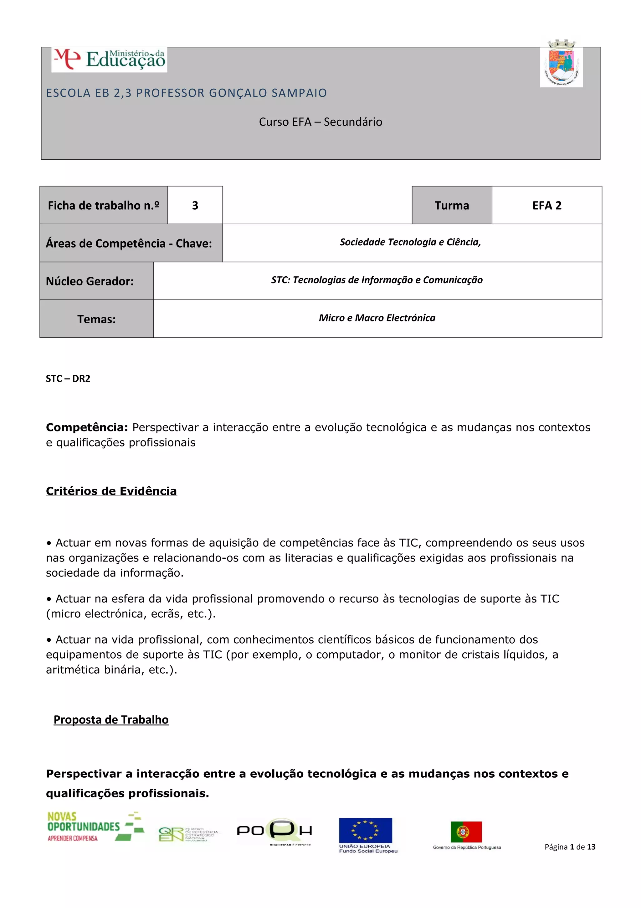 Este documento fornece instruções para um exercício sobre as tecnologias da informação e comunicação. Pede aos alunos que perspectivaram a interação entre a evolução tecnológica e as mudanças nos contextos e qualificações profissionais através de perguntas sobre o uso de computadores em diferentes profissões e idades.