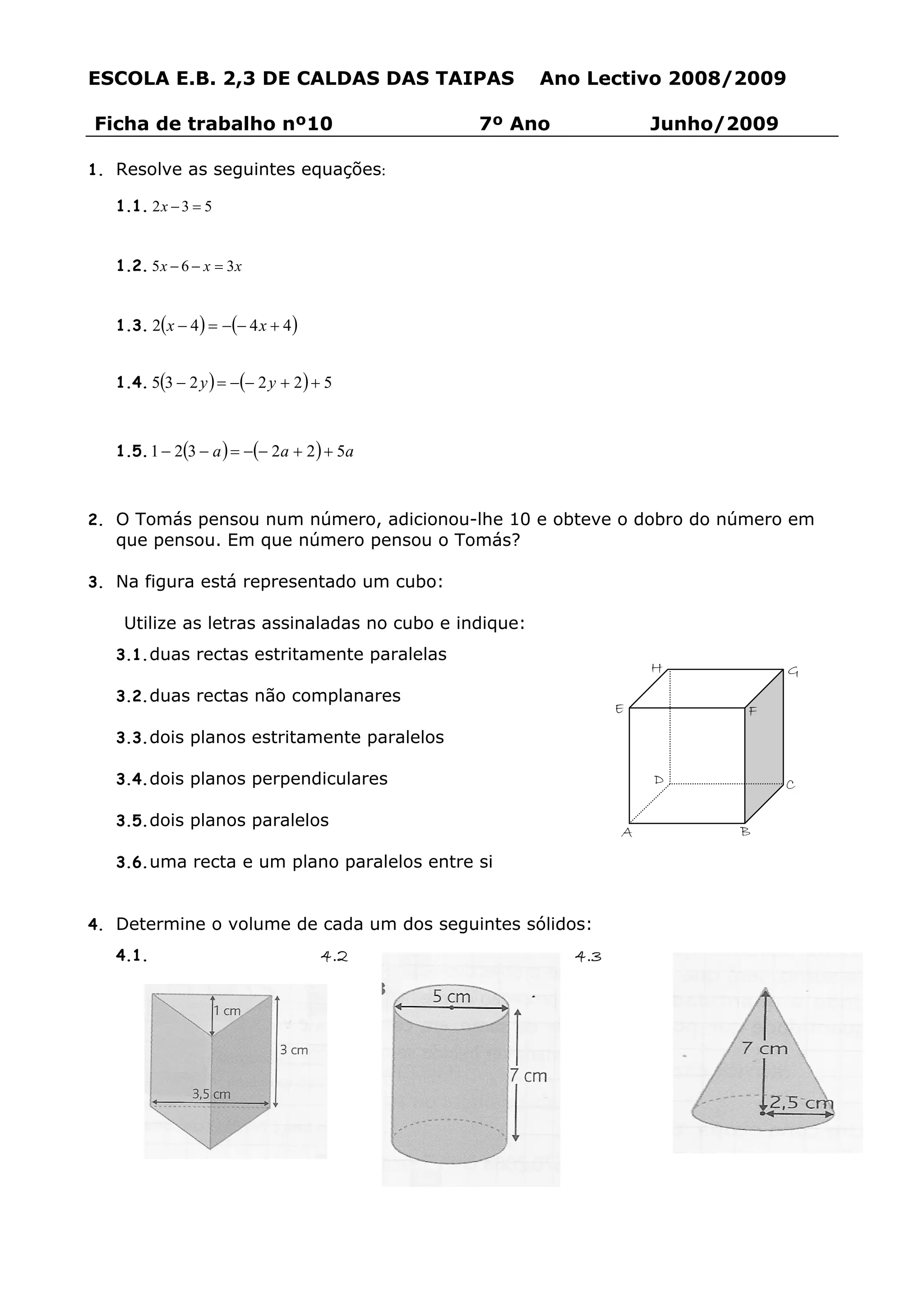 1) O documento contém uma ficha de trabalho de matemática para o 7o ano com exercícios de equações, geometria espacial e cálculo de volumes.
