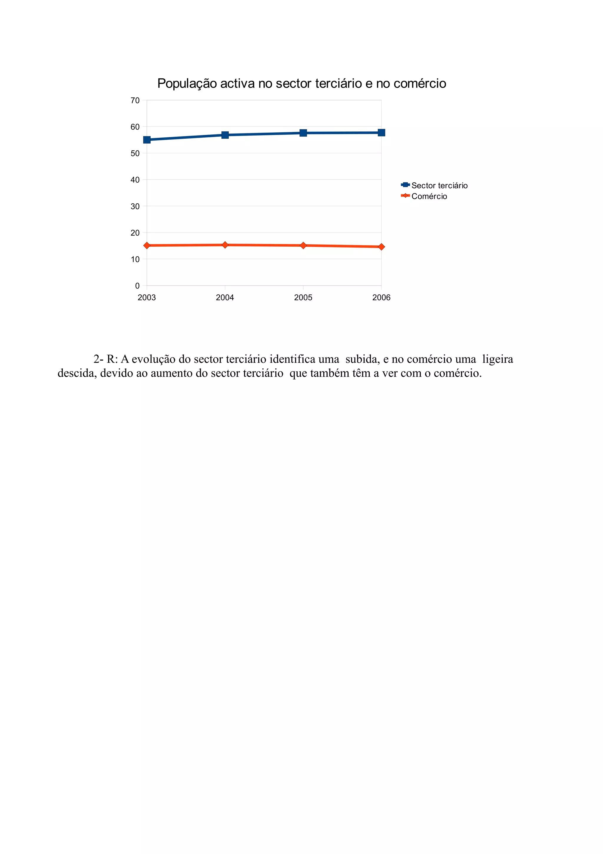 O gráfico mostra que de 2003 a 2006: (1) a população ativa no setor terciário aumentou consideravelmente, enquanto (2) a população ativa no comércio teve uma pequena queda, (3) devido ao crescimento do setor terciário, que também inclui algumas atividades comerciais.