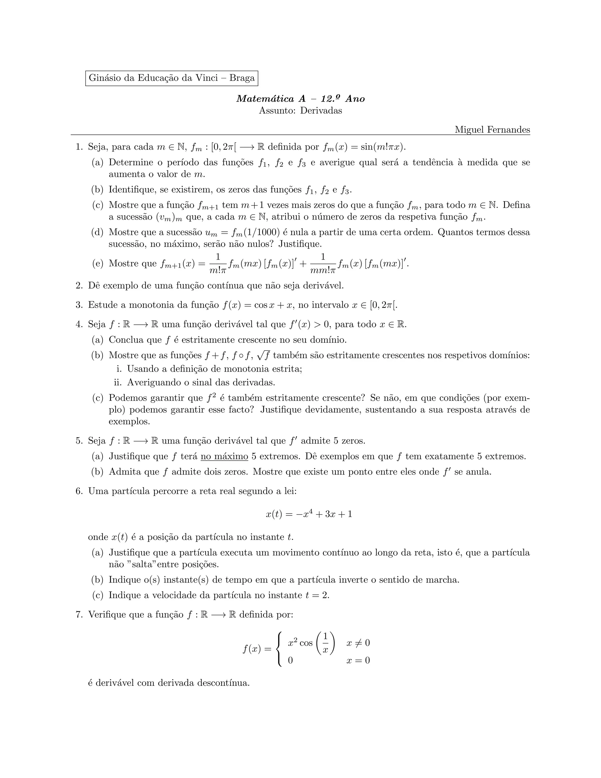 1) O documento discute derivadas de funções matemáticas. Aborda períodos, zeros e sucessões de funções definidas por sin(m!πx).