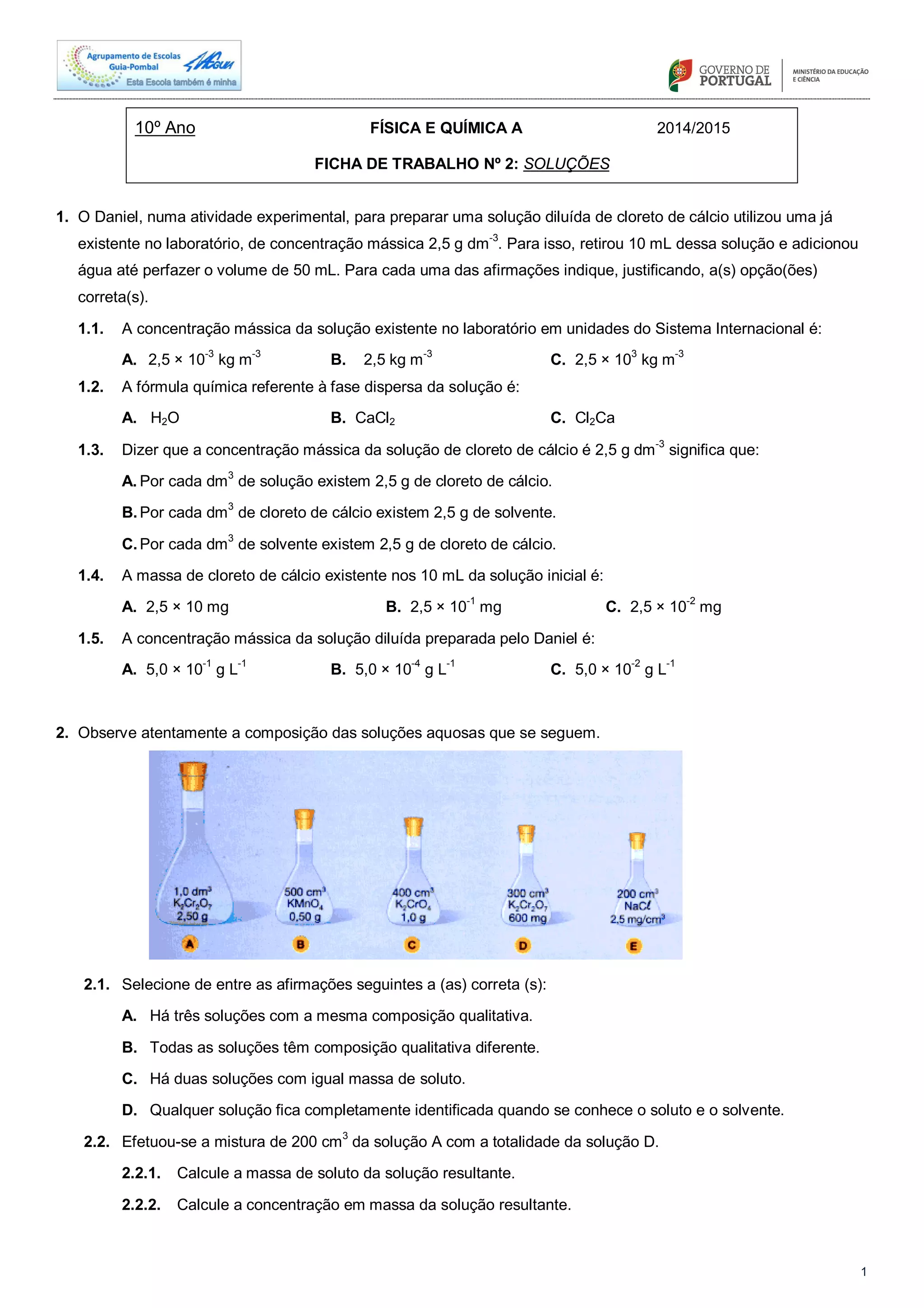 3) Há também questões sobre uma tintura de iodo e uma água mineral engarrafada, pedindo para identificar solutos, solventes, calcular concentrações e massas.