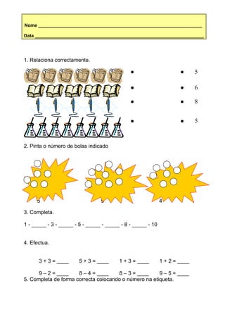 O documento apresenta uma série de exercícios matemáticos básicos para estudantes, incluindo relacionar números, pintar bolas de acordo com instruções numéricas, completar uma sequência numérica, realizar operações aditivas e subtrativas simples, e completar uma tabela com números.