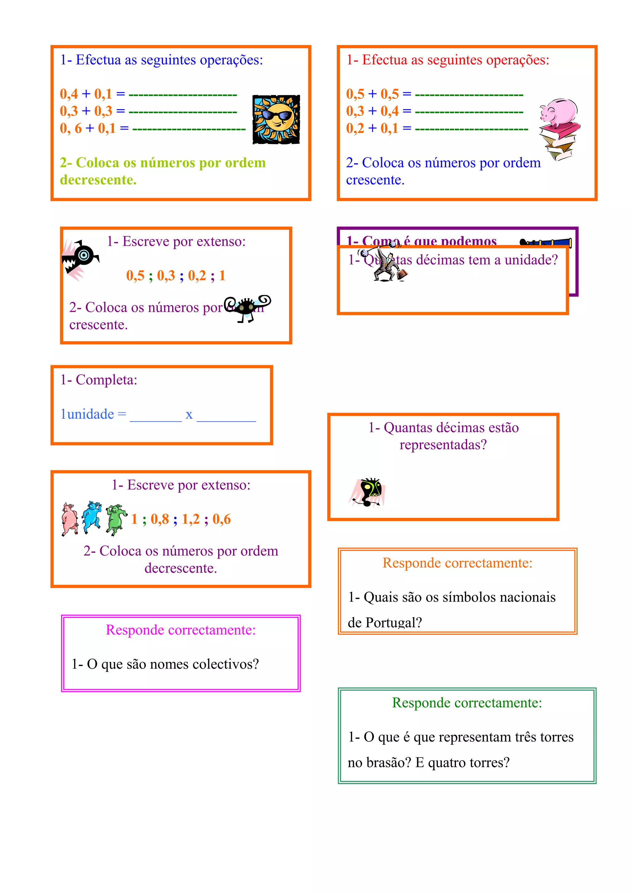 O documento contém vários exercícios matemáticos envolvendo adição e ordenação de números decimais. Os exercícios incluem adicionar e ordenar números decimais, escrever números decimais por extenso, representar quantidades em décimas e completar expressões matemáticas.