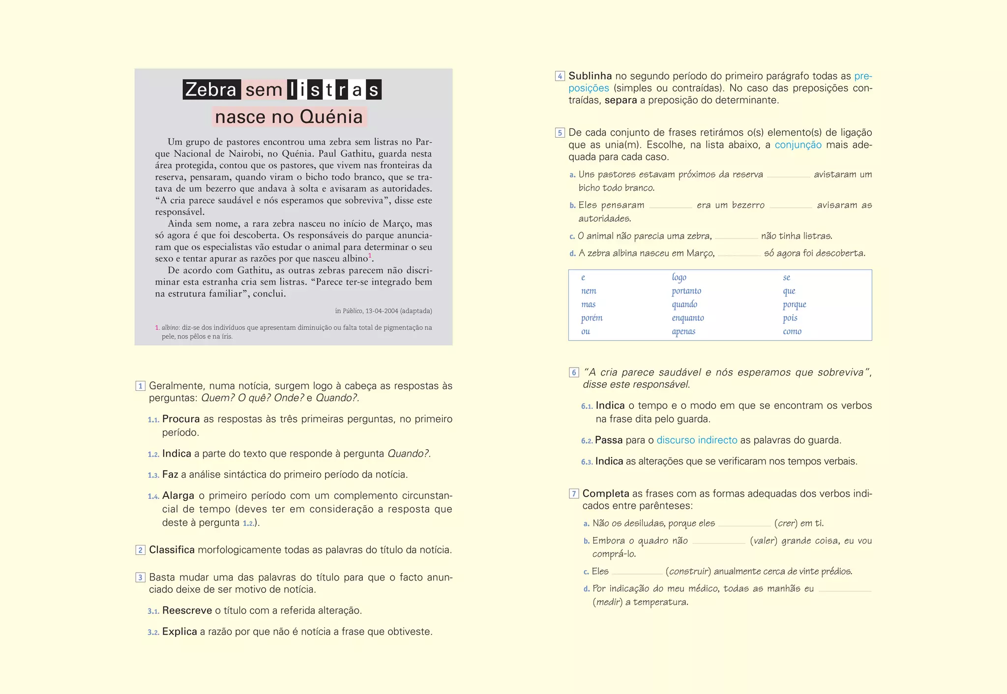 Uma zebra sem listras foi encontrada no Parque Nacional de Nairobi, no Quénia, por um grupo de pastores. A cria nasceu em Março e parece saudável, esperando as autoridades que sobreviva. Especialistas vão estudar a zebra albina para determinar o sexo e as causas da falta de pigmentação.