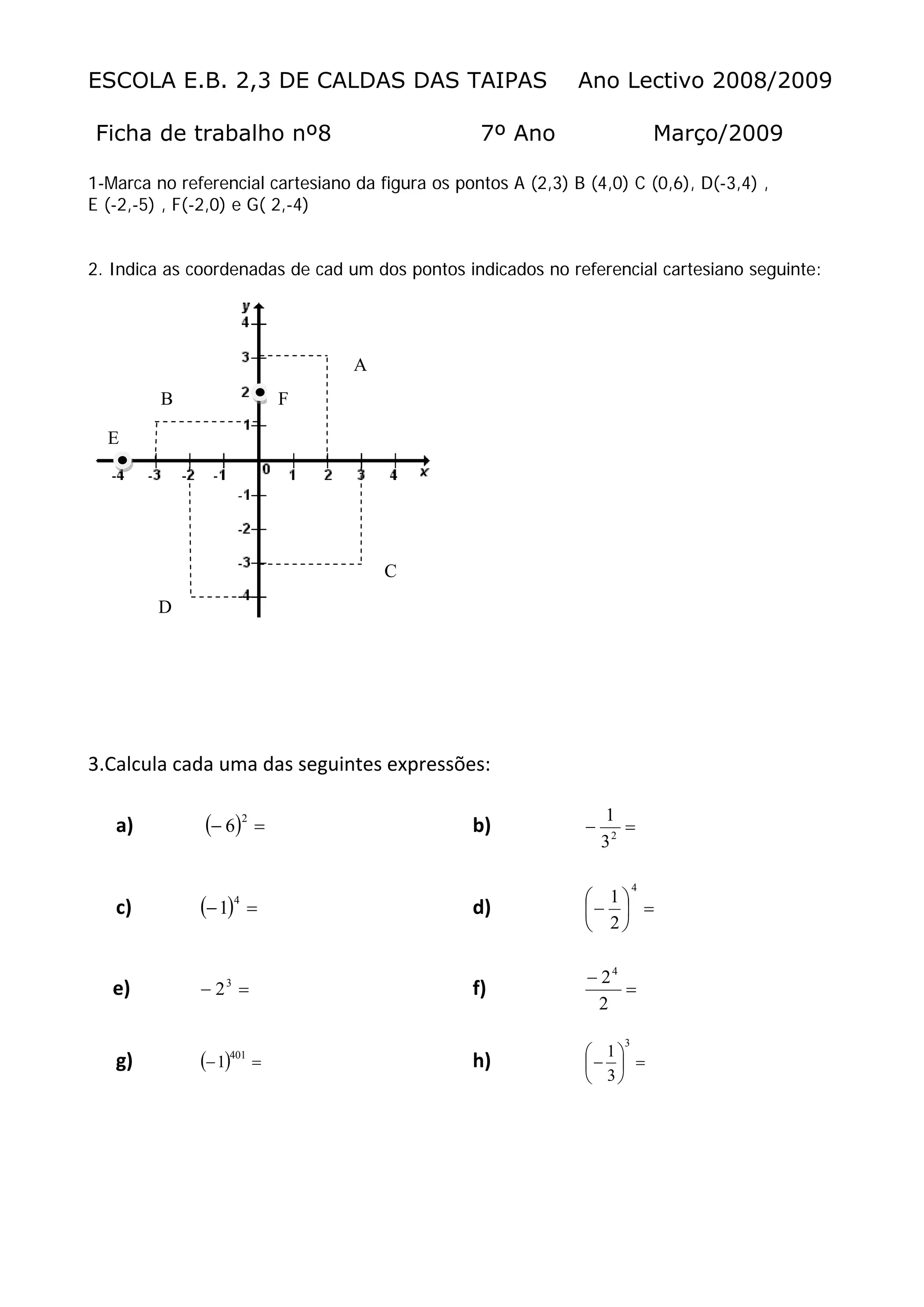 2) Os alunos devem marcar pontos em um referencial cartesiano e indicar suas coordenadas.