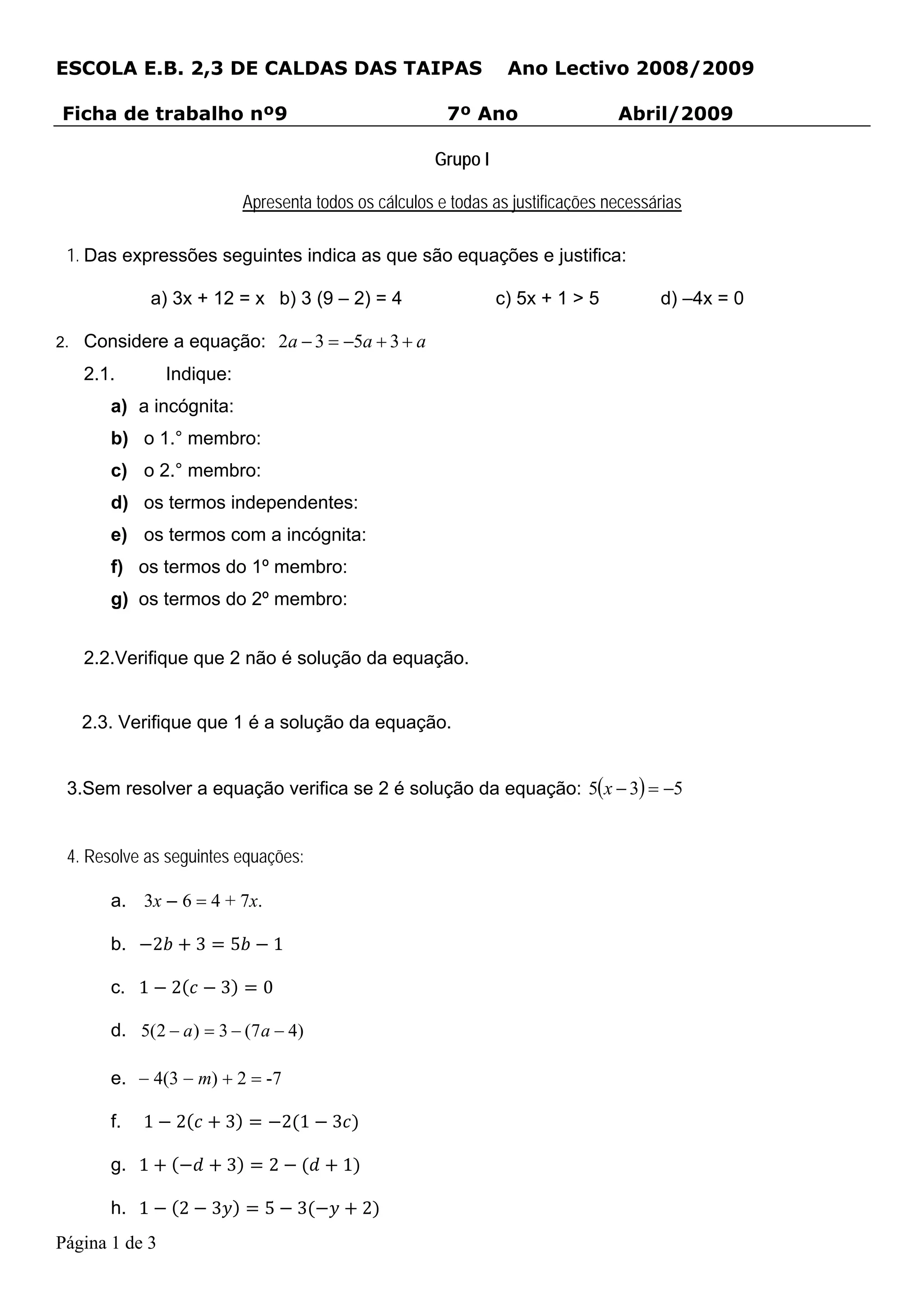 Este documento apresenta 14 questões sobre equações e problemas matemáticos. As questões 1-2 pedem para identificar equações e termos em equações. A questão 3 verifica se um número é solução de uma equação. As questões 4-5 pedem para resolver equações. As questões 6-13 apresentam problemas matemáticos. A questão 14 é um teste de escolha múltipla sobre equações.