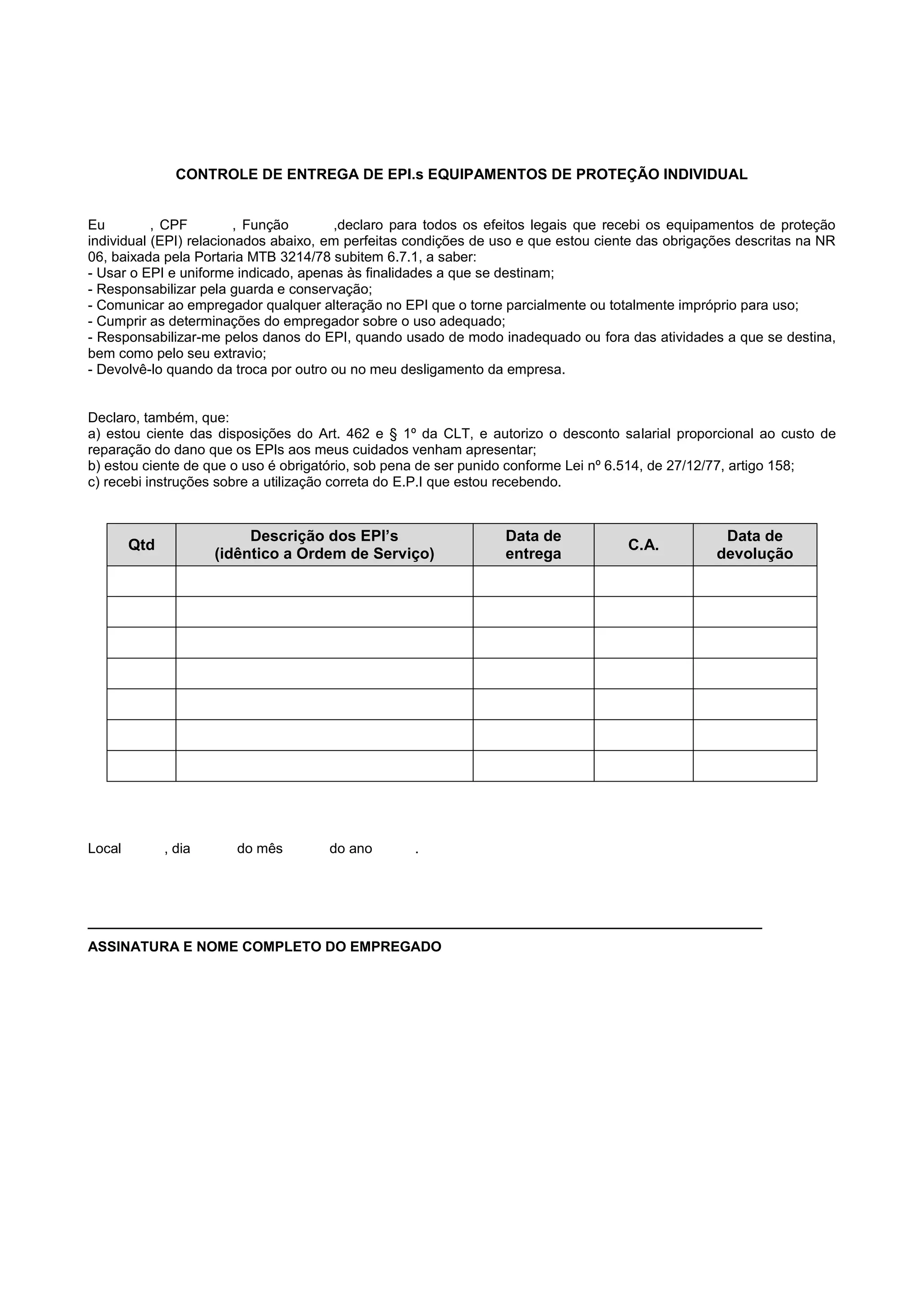 O documento é um termo de recebimento de equipamentos de proteção individual (EPI) por um funcionário, no qual ele declara ter recebido os EPIs em boas condições, estar ciente de suas obrigações de uso, guarda, conservação e devolução dos itens. O funcionário também reconhece as disposições legais sobre danos e uso obrigatório dos EPIs.