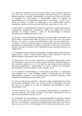 1. O documento discute a abordagem etnopesquisa crítica, que busca compreender as realidades sociais a partir das perspectivas e vozes dos sujeitos estudados.