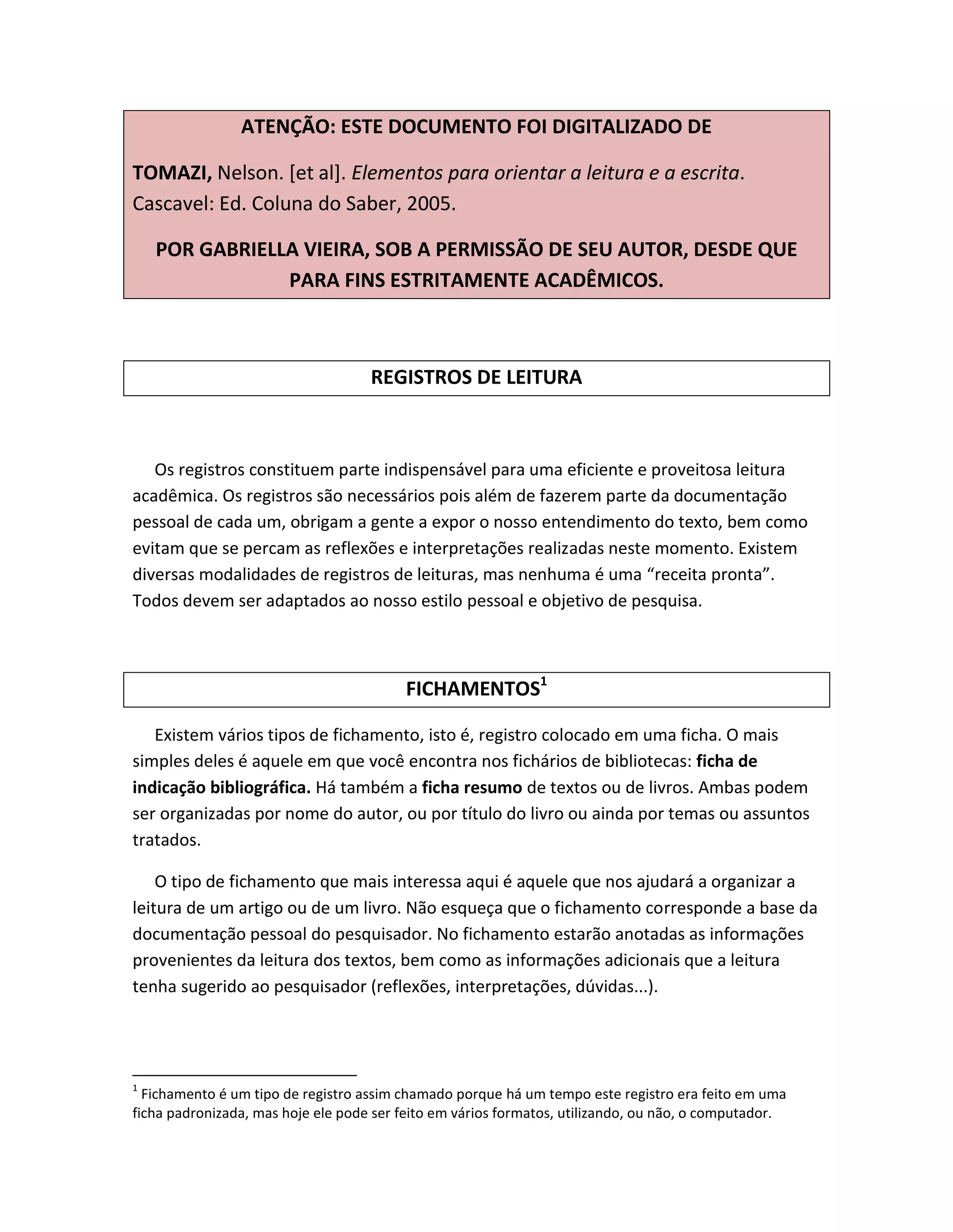 Este documento discute os registros de leitura e o fichamento. Apresenta diferentes tipos de registros e fichamentos, incluindo fichas resumo e hierárquicas. Também discute como organizar os registros para que sejam facilmente recuperados e utilizados posteriormente.