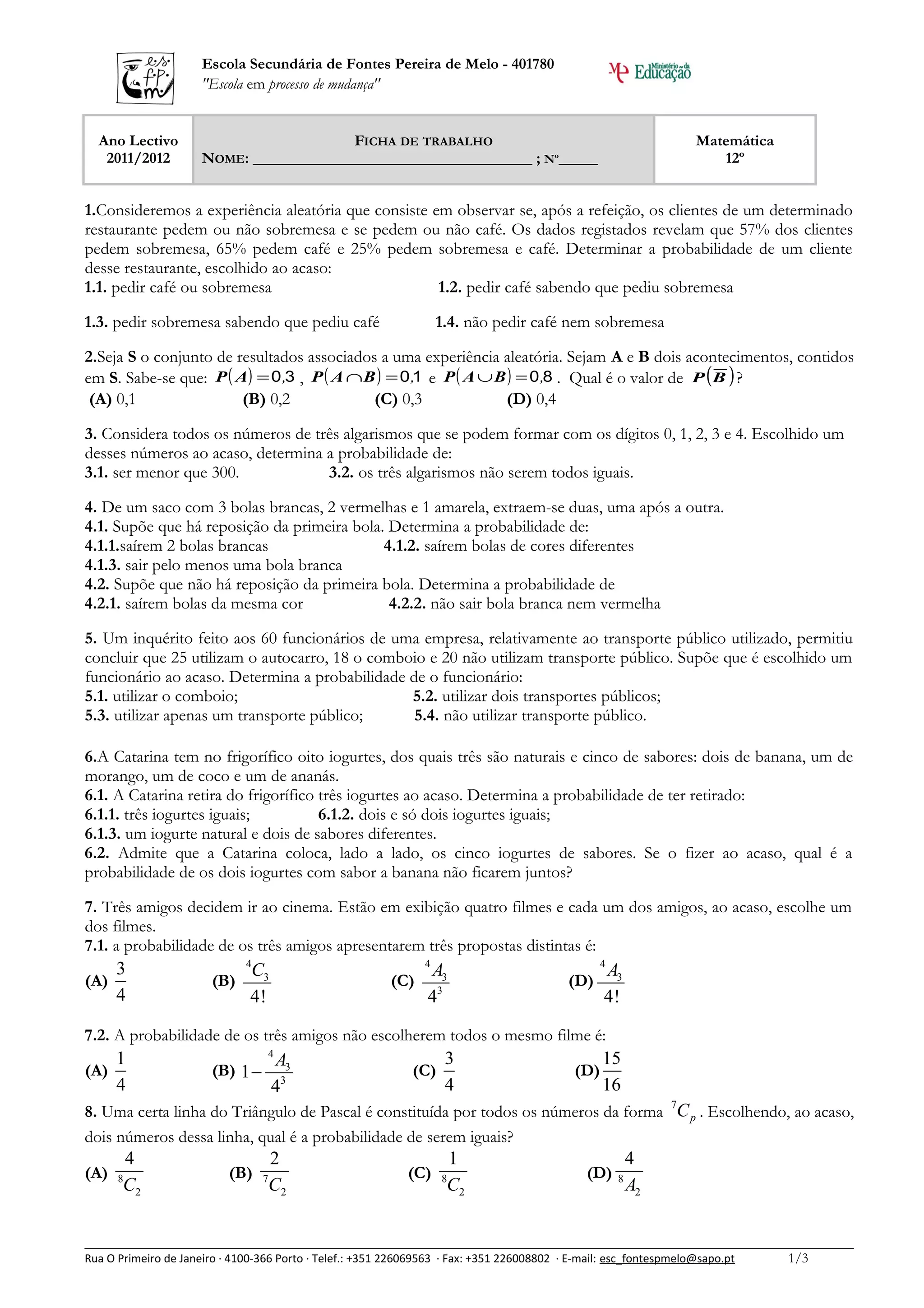 1.Consideremos a experiência aleatória que consiste em observar se, após a refeição, os clientes de um determinado