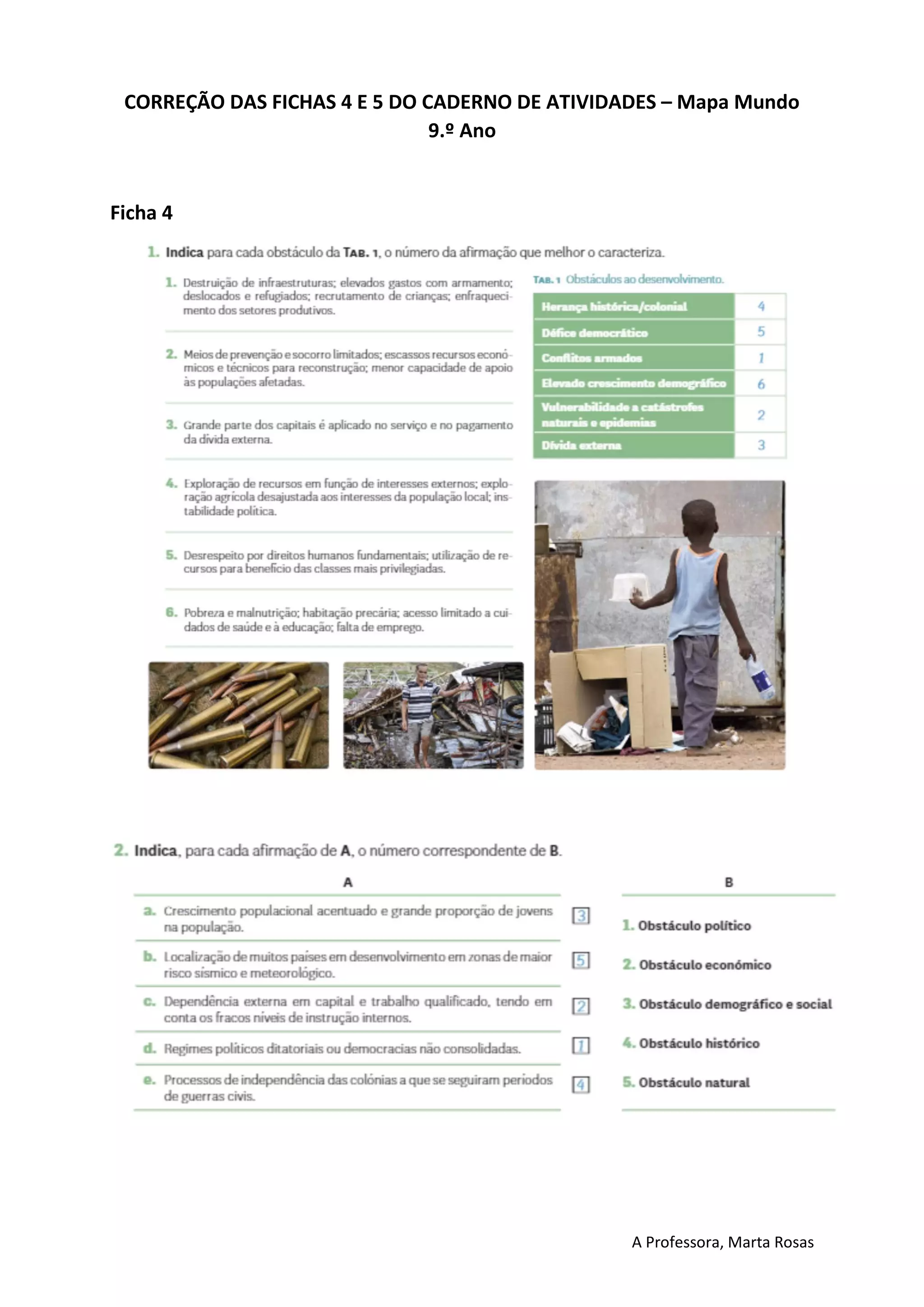 Marta Rosas corrigiu as fichas 4 e 5 do caderno de atividades de mapa mundo para alunos do 9o ano. Ela assinou no final de cada ficha corrigida.