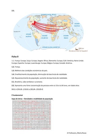 O documento resume as correções das fichas 8 e 9 de um caderno de atividades. A Ficha 8 discute migração temporária versus definitiva, migração interna versus externa, e países com altas taxas de emigração. A Ficha 9 lista os dez principais países de imigração, fatores que afetam fluxos migratórios, e as três principais nacionalidades de imigrantes no país.