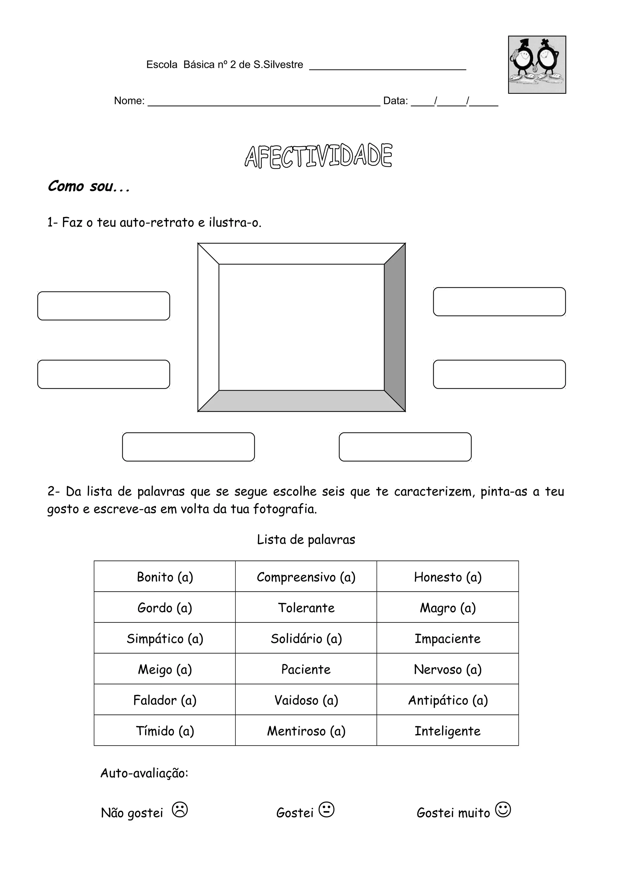 Este documento consiste em uma série de exercícios para crianças sobre autoconhecimento e emoções. As crianças são instruídas a fazer um auto-retrato, escolher palavras que as descrevem, associar emoções a situações, identificar emoções frequentes e raras, e refletir sobre como se sentem em diferentes circunstâncias.