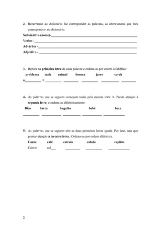 Este documento fornece instruções sobre como usar um dicionário. Explica que um dicionário lista palavras de uma língua em ordem alfabética com suas definições, e fornece regras para consultá-lo, como verificar a classe gramatical e o contexto da palavra. Também inclui exercícios para ordenar palavras alfabeticamente e usar sinônimos.