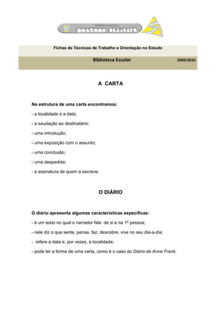 Este documento fornece instruções sobre vários tipos de textos, incluindo cartas, diários, resumos e exposições. Ele descreve as características estruturais típicas de cartas e diários e fornece diretrizes para escrever resumos e exposições, como seguir um esquema claro e usar uma linguagem coerente, clara e precisa.