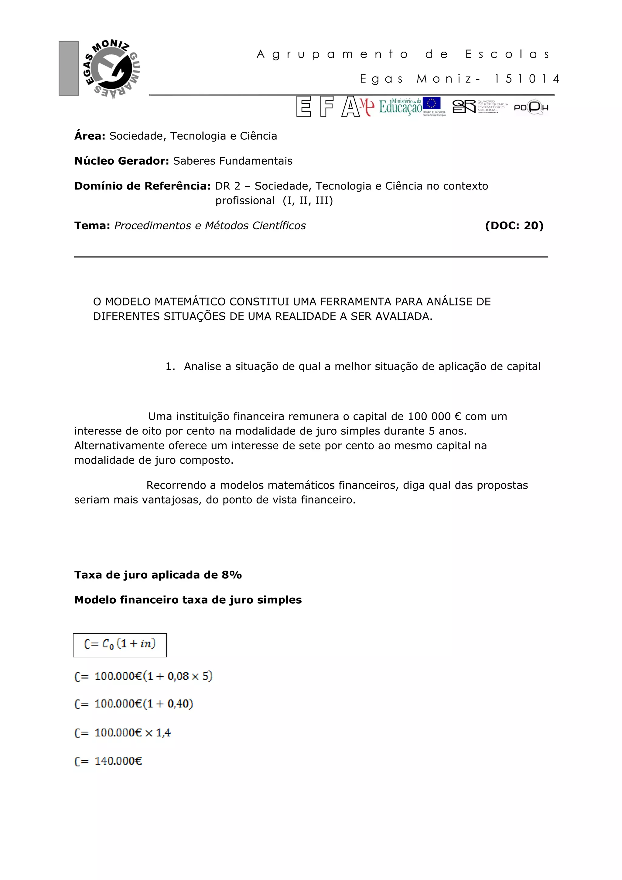 Este documento apresenta vários modelos matemáticos aplicados a diferentes situações reais, incluindo taxas de juros, vendas de computadores, grafos de distâncias entre cidades e decaimento radioativo. Fornece exemplos passo-a-passo de como calcular resultados usando fórmulas matemáticas.