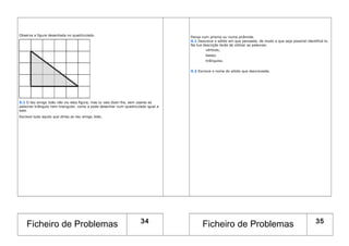 O documento contém vários exercícios matemáticos e lógicos para alunos do ensino básico. As instruções incluem desenhar figuras geométricas, preencher tabelas, ler e interpretar gráficos e resolver problemas de horas e calendário.
