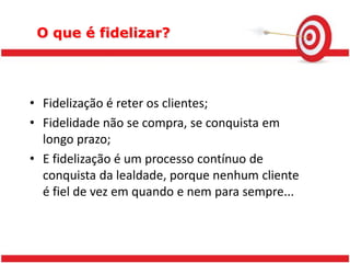 O documento discute a importância da fidelização de clientes para reter clientes e aumentar as vendas, destacando que conquistar novos clientes é mais caro do que manter os atuais. Ele também apresenta uma solução completa de sistema de fidelidade para ajudar empresas a identificar seus melhores clientes e oferecer recompensas e benefícios para aumentar sua lealdade.