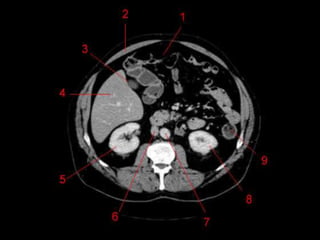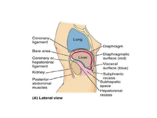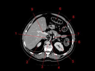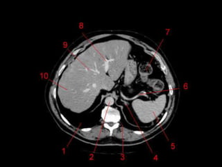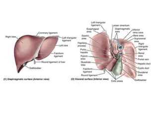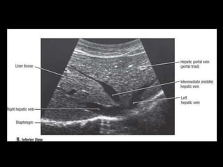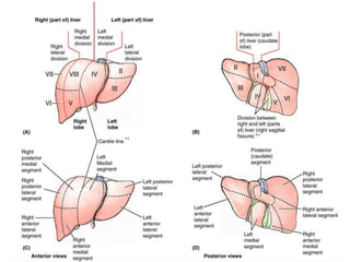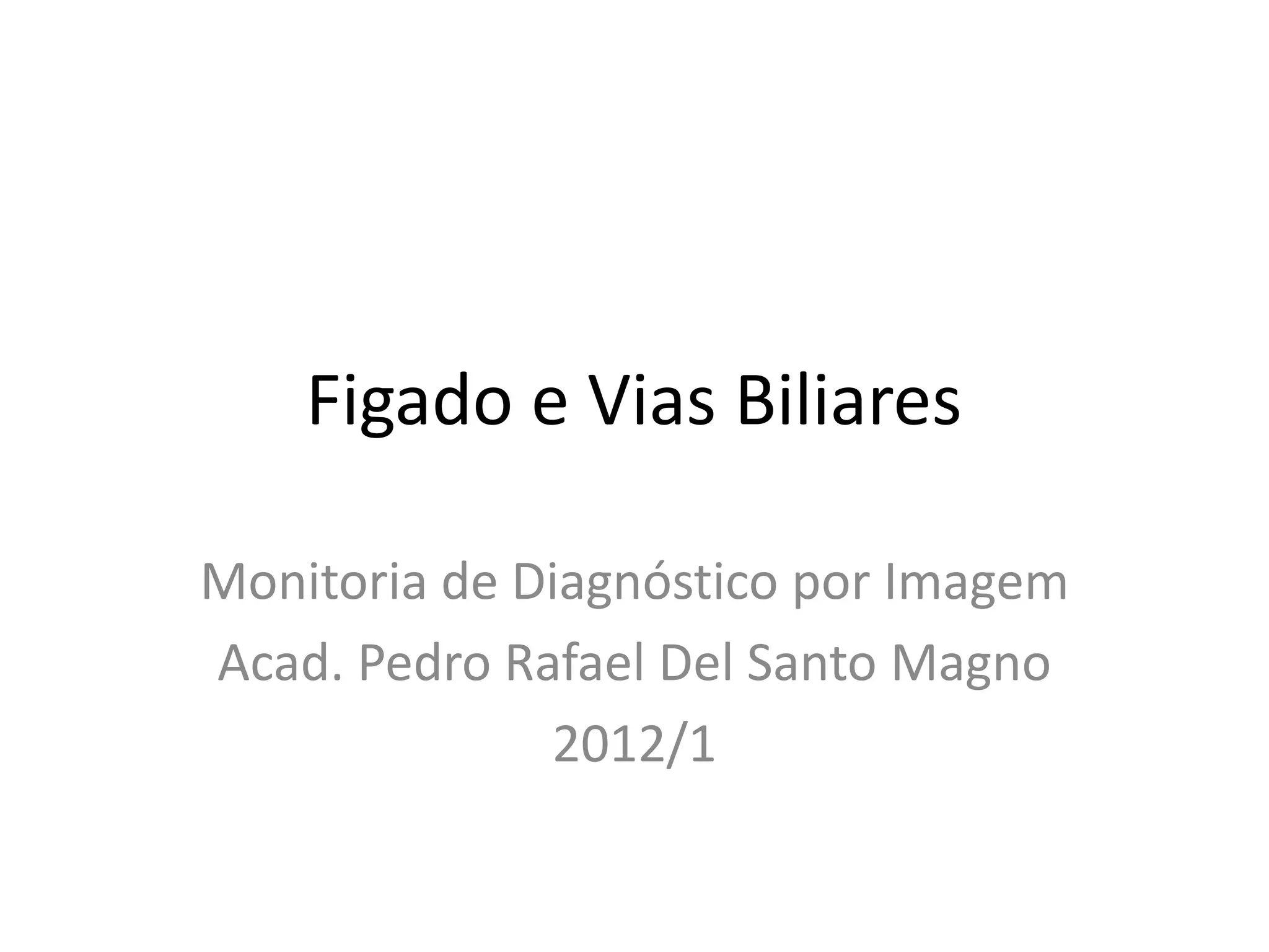 O documento resume as principais características do fígado e vias biliares, incluindo sua anatomia, subdivisão funcional em lobos e segmentos, vasos sanguíneos e ductos biliares. As técnicas de imagem mais usadas para avaliar o fígado e vias biliares são também descritas, com destaque para o ultrassom como principal método.