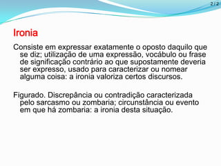 A ironia é uma figura de estilo que consiste em expressar o oposto do que se quer dizer, seja para caracterizar algo de forma sarcástica ou zombeteira, ou para enfatizar uma discrepância ou contradição de forma zombeteira.