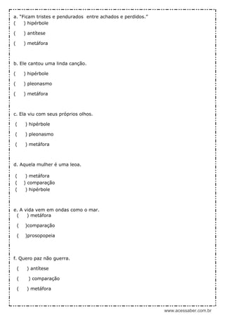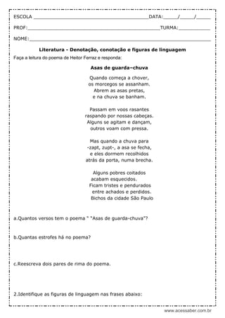 O documento é um teste sobre literatura que inclui questões sobre um poema, figuras de linguagem, linguagem denotativa e conotativa e a música "Certas Coisas" de Lulu Santos. O teste contém questões sobre o número de versos e estrofes no poema, identificação de figuras de linguagem em frases, análise da linguagem de um texto sobre canibalismo entre insetos e identificação de termos denotativos e conotativos.