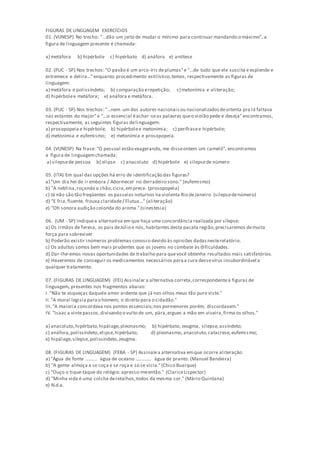 1) O documento classifica e descreve diferentes figuras de linguagem divididas em figuras de palavras, som, pensamento e sintaxe. 2) As figuras de palavras incluem comparação, metáfora, metonímia, sinédoque e catacrese. 3) O documento também fornece exercícios sobre identificação dessas figuras em diferentes exemplos.