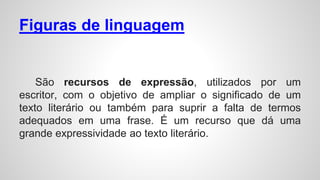 O documento descreve diferentes figuras de linguagem como metáfora, comparação, antítese e paradoxo. Fornece exemplos de cada uma delas, explicando como cada uma funciona de forma a ampliar o significado de um texto ou suprir a falta de termos adequados.
