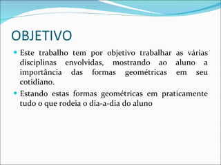 Este documento descreve um trabalho que visa mostrar aos alunos a importância das formas geométricas no cotidiano através de disciplinas como Física. O objetivo é calcular área e volume de figuras geométricas e como elas são afetadas pela dilatação térmica. A metodologia envolve cálculos de área, volume e dilatação de sólidos. A avaliação será por meio de exercícios práticos nos quais os alunos devem mostrar os cálculos envolvidos no processo.