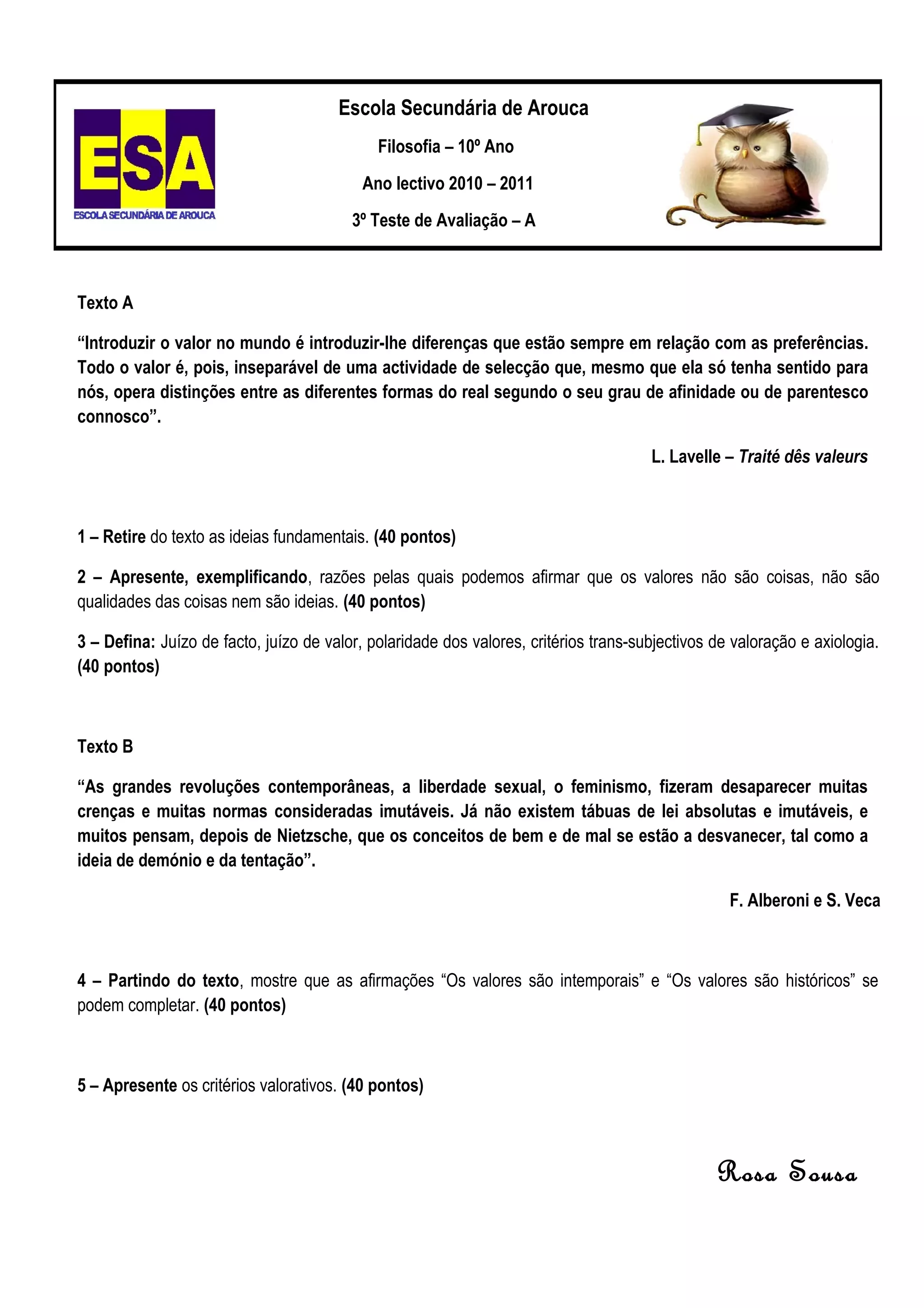 Este documento é um teste de avaliação de filosofia do 10o ano sobre valores. Contém dois textos e cinco perguntas. O primeiro texto discute a introdução de valores no mundo através de distinções e preferências. O segundo texto discute como revoluções contemporâneas fizeram desaparecer normas e crenças, levando alguns a pensar que conceitos como bem e mal estão se desvanecendo.