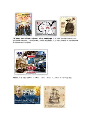 (0,70 BAM). 09.10.2011, Dia do Correio – Fibulae (1,00 BAM). 10.10.2011, 150 Anos do nascimento de