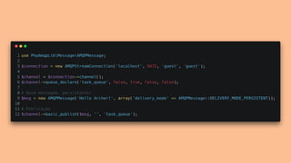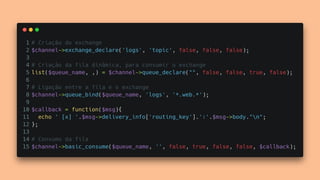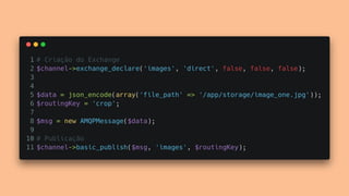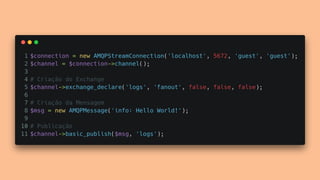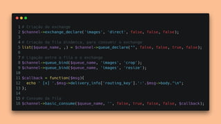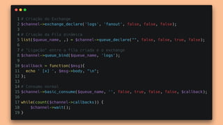 O documento apresenta os principais conceitos e benefícios da fila de mensagens RabbitMQ. O palestrante discute como o RabbitMQ permite a comunicação assíncrona entre sistemas através de publishers, queues e subscribers, e como exchanges e bindings direcionam as mensagens para as filas corretas. Ele também aborda os tipos de exchanges e a diferença entre persistência e durabilidade no RabbitMQ.