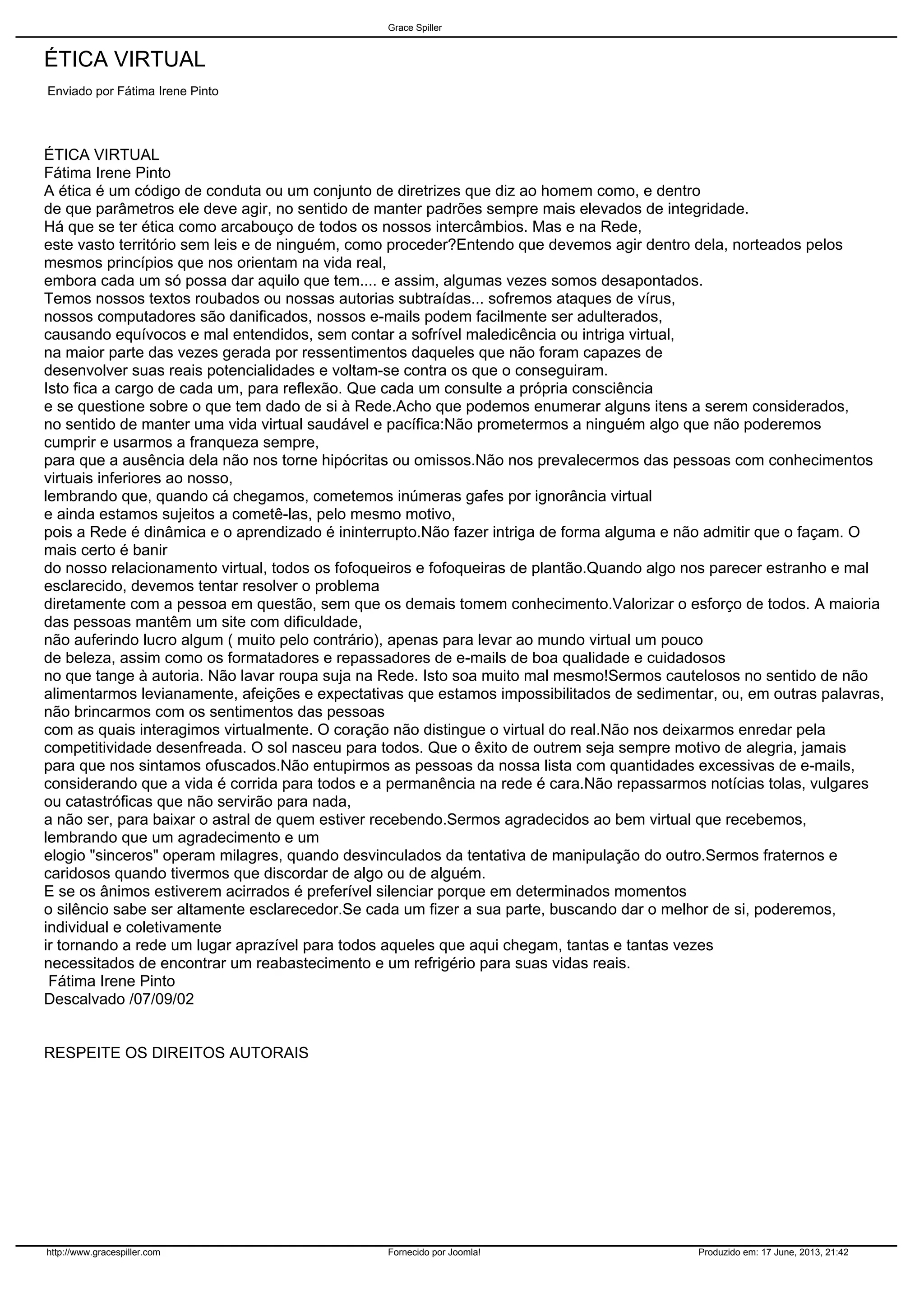 O documento discute princípios éticos para interações virtuais, como ser honesto, evitar fofocas, valorizar o esforço dos outros, e não manipular os sentimentos das pessoas online. A autora argumenta que devemos agir com os mesmos princípios de integridade na internet como na vida real.