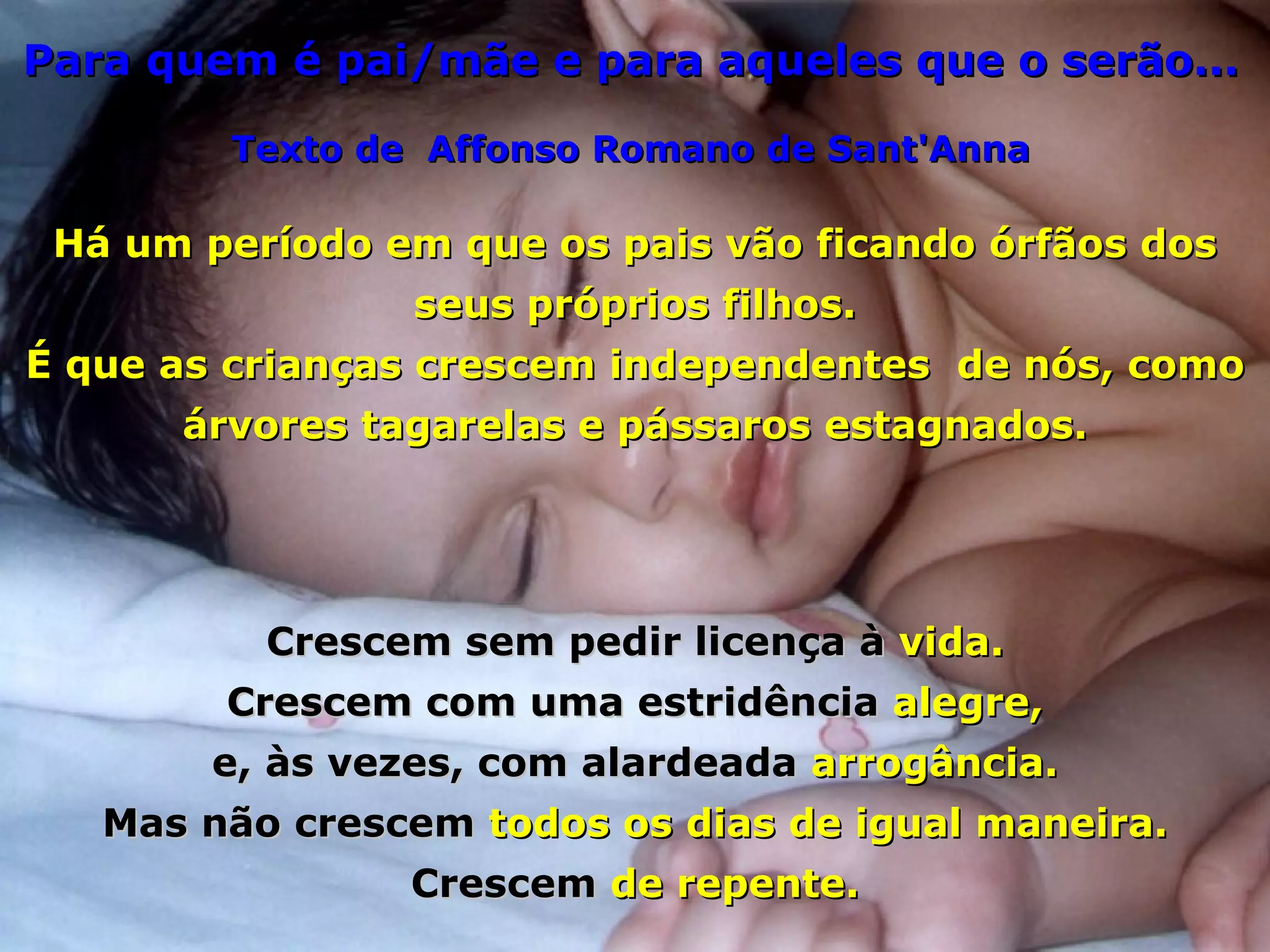 O documento discute como os pais eventualmente se tornam "órfãos" de seus próprios filhos à medida que eles crescem e se tornam independentes. Ele descreve como as crianças crescem de forma orgânica e desobediente, e como os pais ficam esperando por eles na porta da discoteca. Finalmente, os filhos assumem o volante de suas próprias vidas.