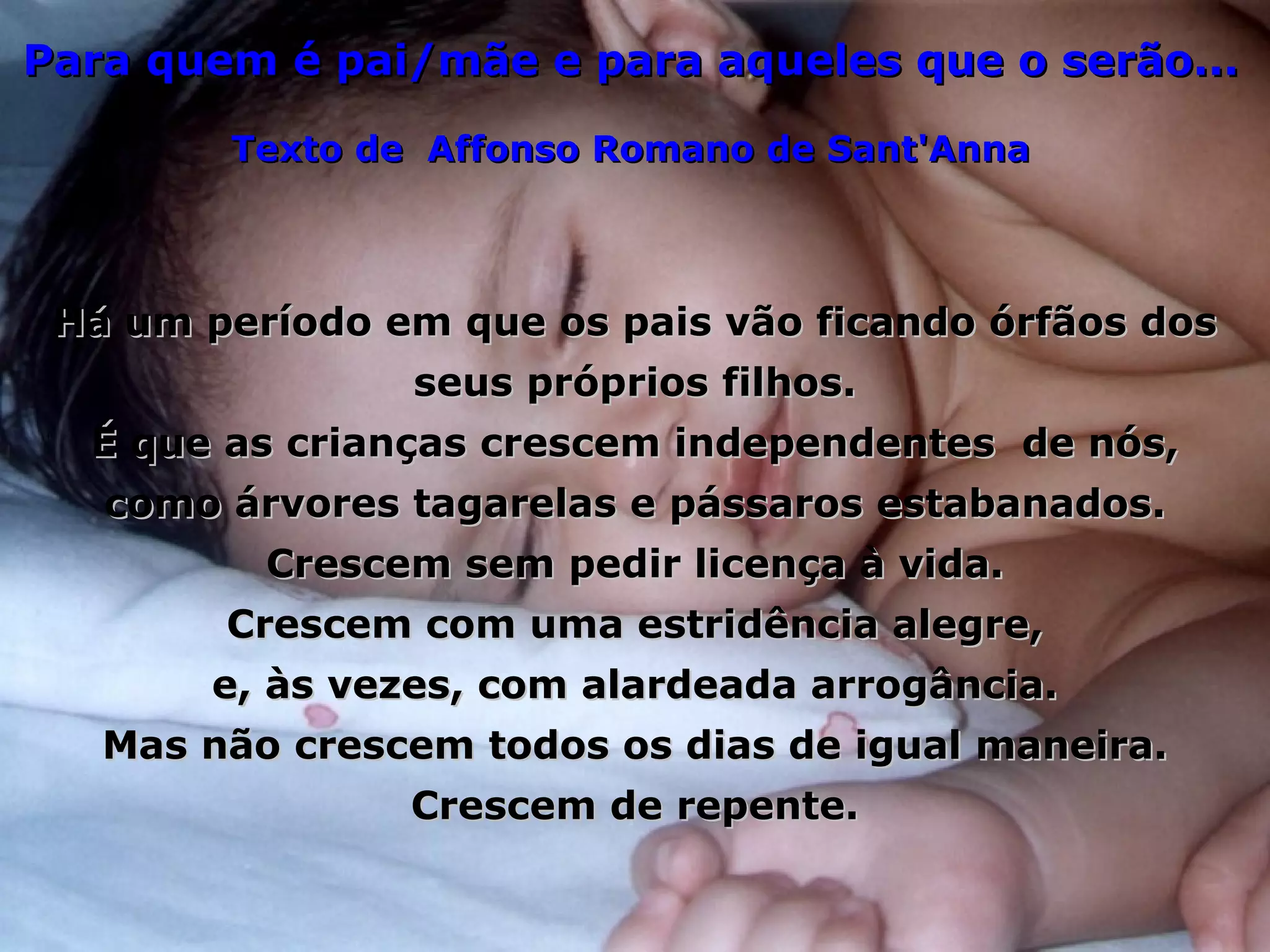 O documento discute como os pais eventualmente se tornam órfãos de seus próprios filhos à medida que eles crescem e se tornam independentes. Os filhos crescem rápido demais para que os pais percebam, e eles logo estão dirigindo seus próprios carros e tomando suas próprias decisões. Os pais então ficam ansiosos esperando por seus filhos, agora adultos, e eventualmente podem se tornar avós e ter outra chance de demonstrar seu afeto.