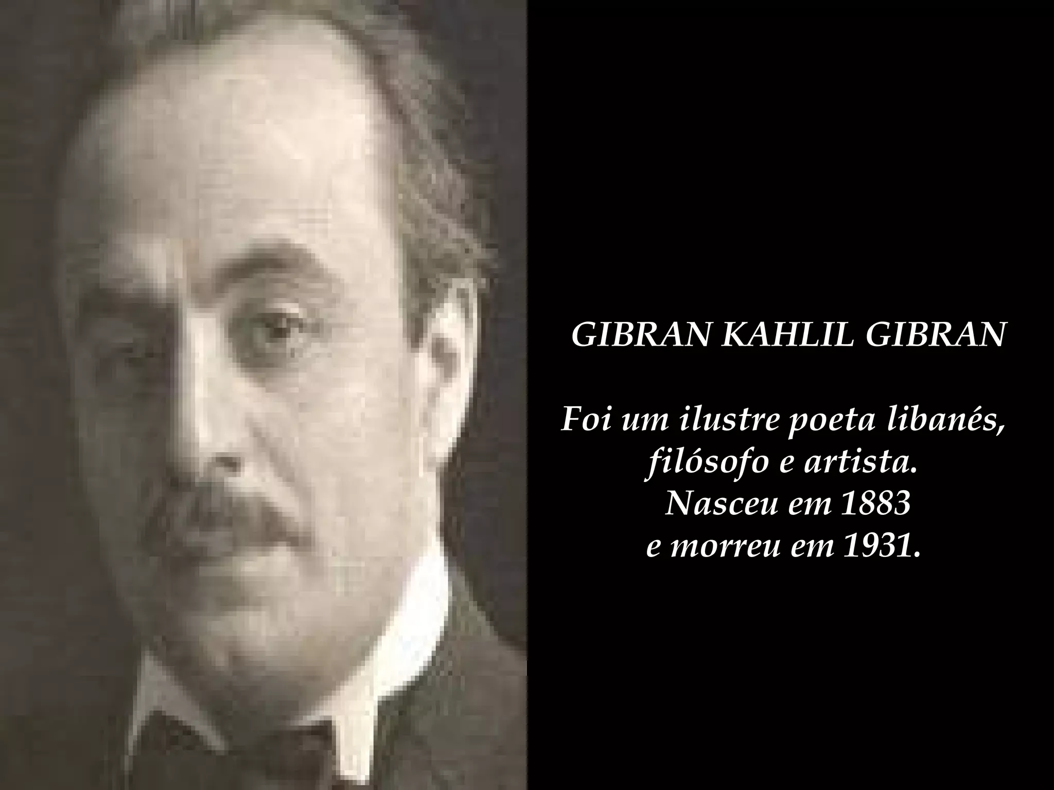 Gibran Kahlil Gibran foi um poeta, filósofo e artista libanês que viveu de 1883 a 1931. Sua poesia e reflexões sobre temas como filhos e liberdade foram traduzidas para mais de 20 idiomas e influenciaram muitas pessoas ao redor do mundo. Quando perguntado sobre filhos, Gibran disse que embora os pais possam amá-los, as crianças não lhes pertencem e devem ser livres para voar com suas próprias asas quando estiverem prontas.