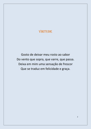 Este poema é uma coleção de poemas escritos por Filipa Duarte sobre vários temas como o vento, paixão, amor, saudade, educação e fé. Os poemas exploram sentimentos como felicidade, nostalgia, desejo e solidão através de descrições sensíveis da natureza e das experiências humanas.
